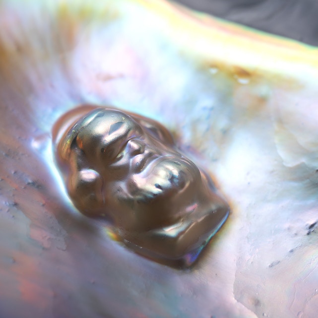 同時に、近年多くのアーティストによって試みられる「複数の生物種(multi-species)による協働」の実践の一例として、本作を単純に理解するべきではない。当たり前ではあるが、私たちが例えば、虹色に輝くマルクスの肖像の真珠を目撃するとき、それには同時に真珠貝の生命としての「死」が結びついている。真珠貝にとってこの協働はすなわち死を意味するのである。ここでは、「マルクスの亡霊」(ジャック・デリダ)と「真珠貝の亡霊」が、その存在論的な差を問われる前に、真珠の光沢作用である「オリエント効果」によって揺らめきながら、「貨幣の化石」の物語としてある種オリエント化され、アートワールドの市場の現実へ向かっていく(*3)。「人新世」の言説のなかで複数の存在論が多様に議論される今日、多くのポストヒューマン理論が、人間(Human)と非人間(Non-human)の分類を乗り越えようとするいっぽうで、生命(Life)と非生命(Non-Life)の境界はなんとか維持しようともがいている。このような状況下で、生命と非生命の分割(生と死の分割)の差異ですら「生物種-貨幣-肖像-化石」という経済・地質・考古学的なアッサンブラージュへと変容させてしまう本作は、私たちがむしろ「地球的/地質的存在論(geoontology)」(エリザベス・A・ポヴィネッリ)の時代へと突入していることを示唆しているかもしれない(*4)。