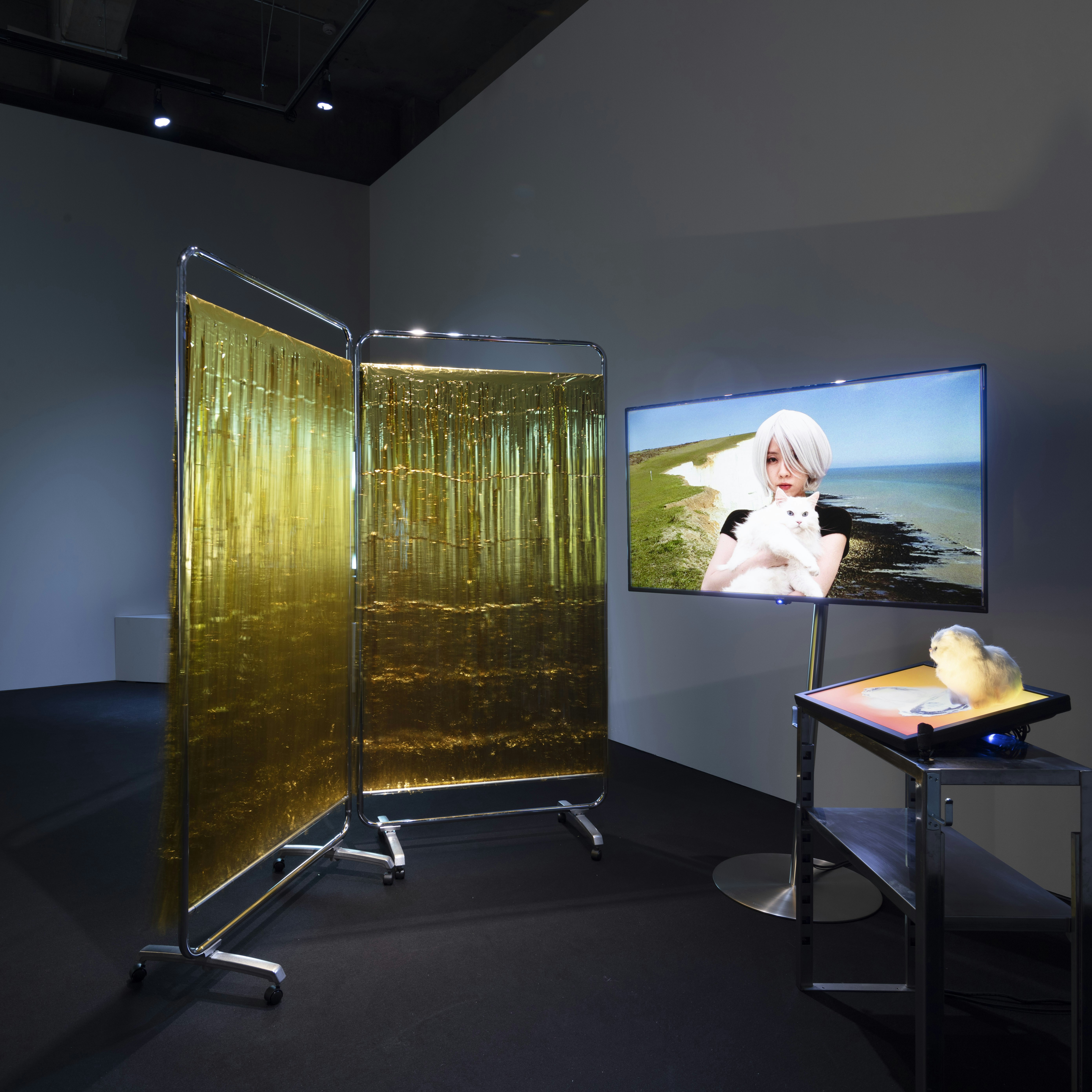 石原海《牡蠣のような猫が落ちてくる》は短いエピソードによる、映像と現実との間を横断したインスタレーションだ。友人の手品師によって、猫のぬいぐるみを生きた猫として認識するようになった「アタシ」は、酩酊のなか「生きた猫」を「牡蠣」に見間違える。最終的に病院へとたどり着く、数珠繋ぎのように展開する妄想の物語の一方、輪郭を切り抜いた素材による映像からは、記号的なモノへのフェティッシュな感覚を見ることができる。医療用のパーテーションにかけられた金色のホイルカーテンは、辛うじて隔てられた妄想=フィクションと現実との境界を示すように、絶えずそよいでいる。