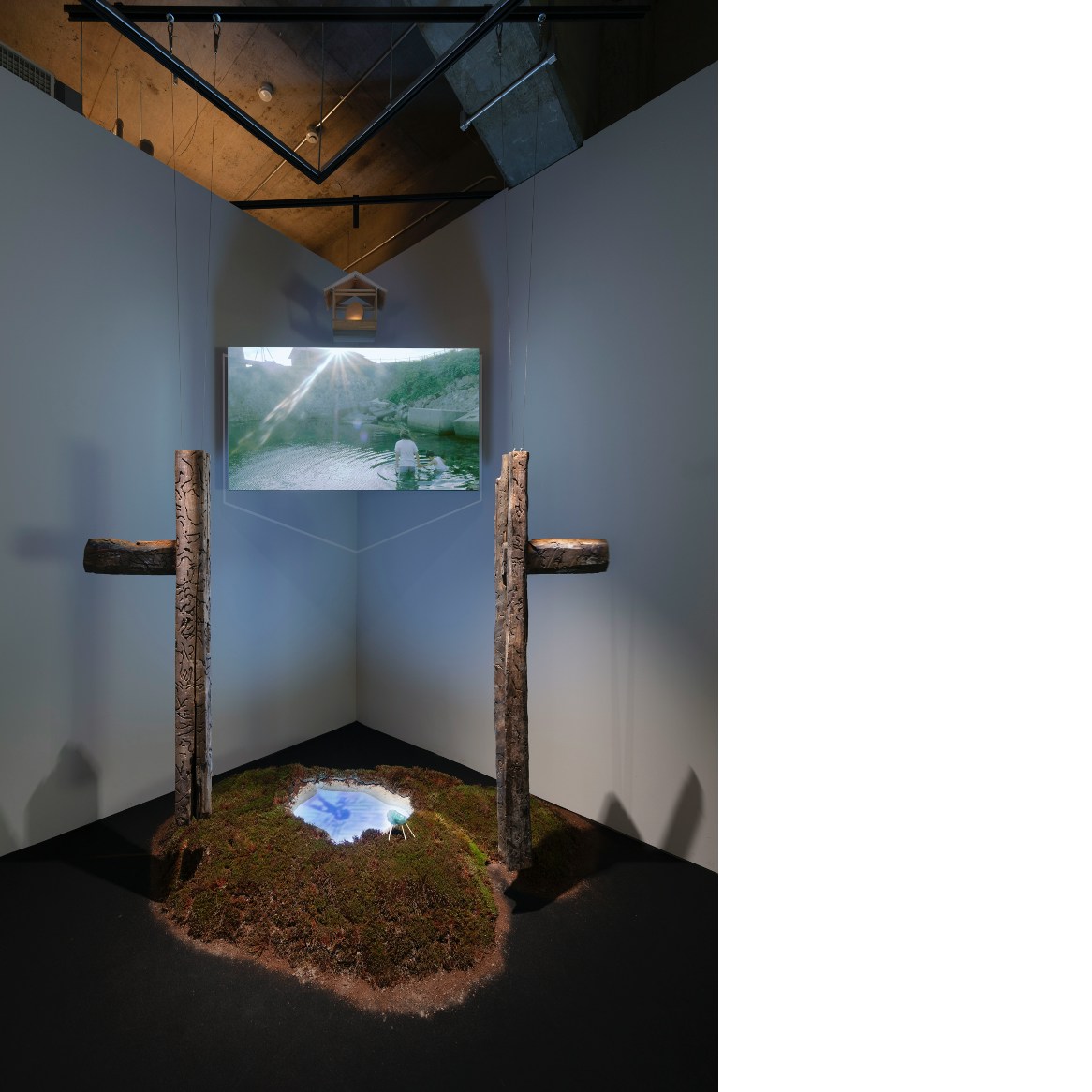 《Altarcall》においては、女性の入水によってできたという伝説が残る浮島の中心の「池」部分がモニターになっており、ブロックノイズと色調が様相を絶えず変え、水面、微生物、映画の字幕、浴槽の赤い水面に身体をうずめる人影などを映し出す。そのタイトルが仄めかすとおり、祭壇の前に立つことと、映像を見つめることの役割は重なり合う。