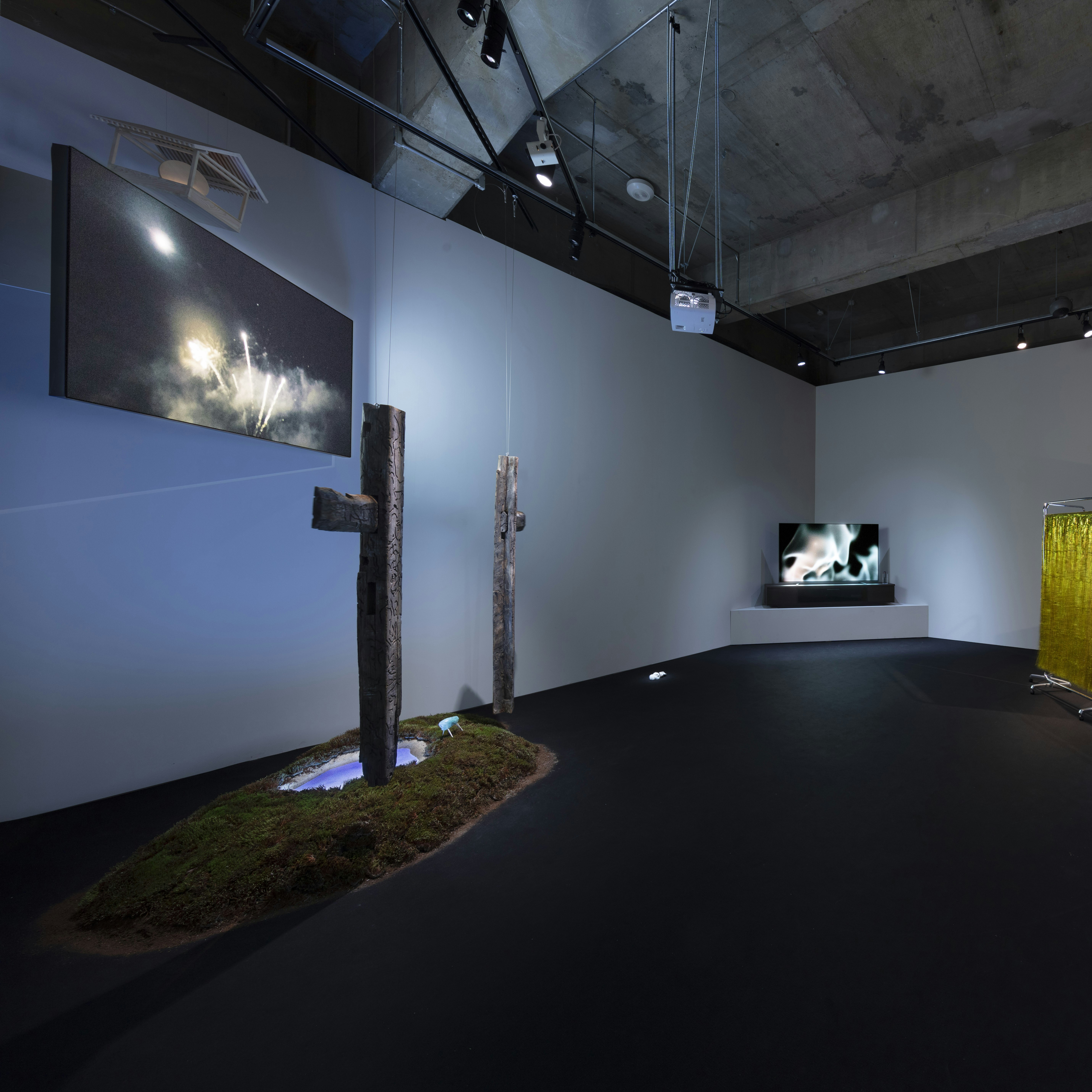 長谷川億名は、佐渡島に住むある家族との日々のドキュメンタリー《First Memory of the Ocean》と、映像内にも登場する神秘的な浮島「乙和池」を模した祭壇のようなインスタレーション《Altarcall》(山井隆介との共作)を発表した。一見、南北に分断された近未来の日本を舞台にしたSF3部作「日本零年」のアプローチとは対照的に感じられる。しかし、脱走兵として死んだ友人に会うために過去と未来にトリップできるドラッグに溺れる青年の物語『イリュミナシオン』(2014)も、亡くなった娘が情報生命として生きているかもしれないと南部へ渡る看護師の物語『デュアル・シティ』(2015)も「死を受け入れること」を描こうとするものであり、ある場と共同体、信仰と死生観といった通底する主題を見ることができる。
