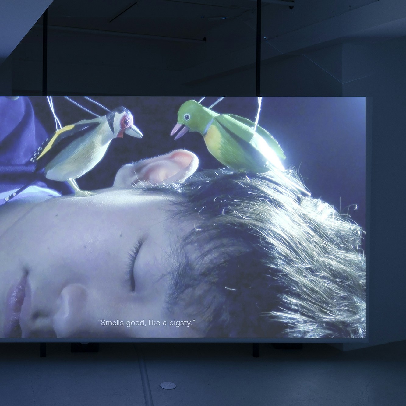 高田は、本展の中で性をテーマとした5つの映像作品を展示していた。思春期の少年の夢想(=夢精)をテーマにした《The Princess and the Magic Birds》は、部活動を彷彿とさせるスポーツ用具が並ぶ部屋の中で、2匹の小鳥が少年の耳元で淫靡な物語をさえずるという作品である。アラビアのとあるお姫様が身分の低い男たちと体を重ねていくこの物語は、身分の高さと相応の振る舞いを求められる立場による抑圧を破って、欲望を満たし、その悦楽へと大胆に踏み込んでいく話である。それは、王女というペルソナを纏う一方で、性衝動に突き動かされるシャドーを抱えたひとりの両面を描いている。荒い呼吸とともにその物語をさえずる小鳥は、淫らな欲望に溺れる人間の物語を、純白で無垢な少年の心に垂らし、汚してやりたい、という欲望に駆られている。それは、純粋なものに向けられた大人たちの下卑たる眼差しであり、少年愛や少女愛に通じる。高田は少年愛に関するエッセイで知られる稲垣足穂を読んでいたという。