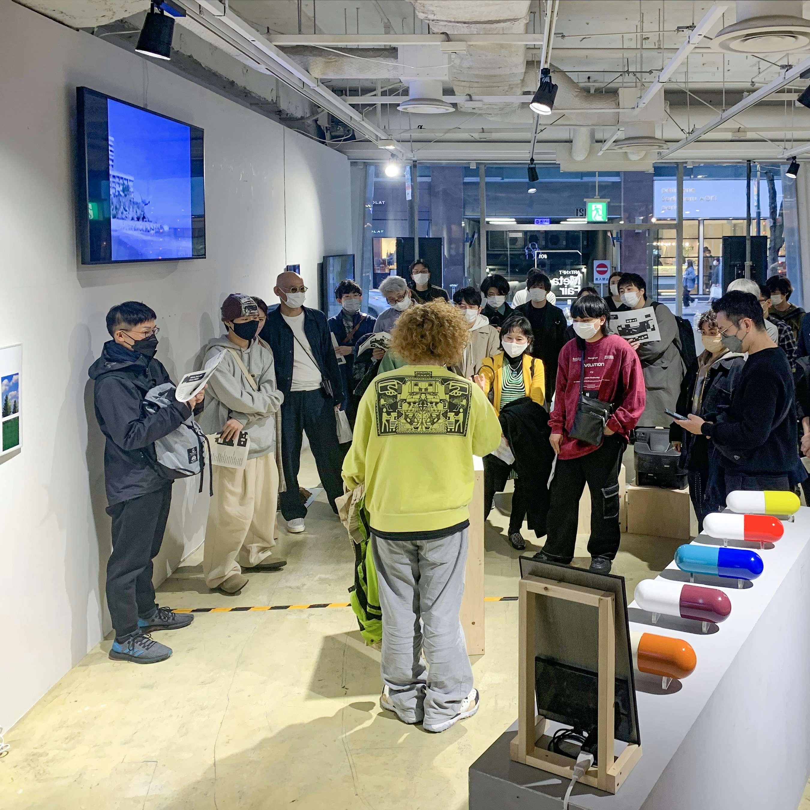 さて、このような各出展作品の解説は本家に任せたい。どういう意味かというと、このフェア中、1日に何度も開催されるキュレーター丹原自身による全作品の解説ツアーがあり、またこのツアーこそが本フェアにおいてもっとも着目するべき特徴なのだ。上記のように、ハイコンテクストかつメタ言語による応酬を展開する多くの難解な作品を、NFTを知らない一般来場者層でも理解できるように声を張って解説する丹原の態度は、カッティングエッジたる国内初のNFTフェアの企画した立場としては、あまりにも泥臭いフィジカルな基盤、個人の身体に依拠している。