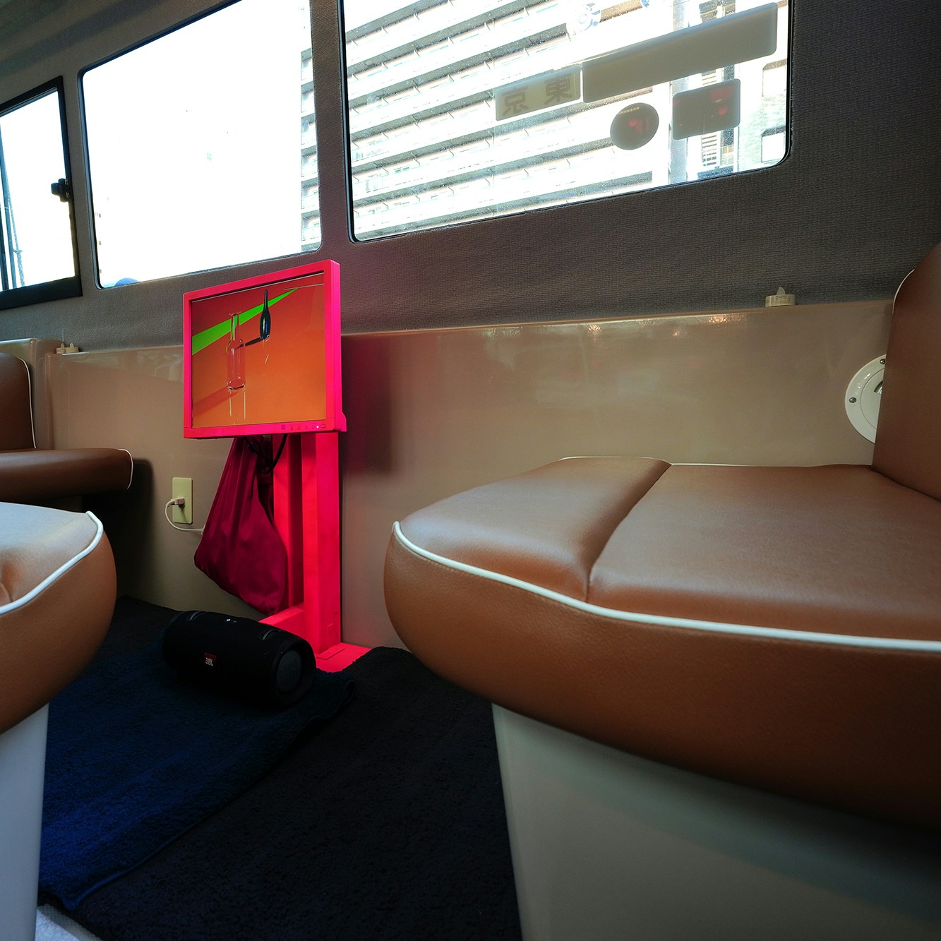 潮の香り、風の圧、空の広さ。こうした海の体験は、たとえば屋形船で川を水平に滑っていくときの身体感覚とはまた違ったものであるはずだ。Aokidが空を仰いで片手で弧をつくり、たなびく雲に呼応する仕草を見せた。船内のモニターからは藤倉による3DCGの映像作品とプロジェクトメンバーのインタビューを交えたラジオ番組が流れ続けている。これらは集中を要さない気散じ的な視聴覚空間を立ち上げ、船のエンジン音や波の音とは別系統のオーディオを多層的に形成する。