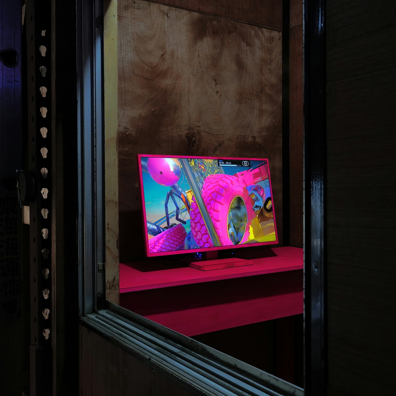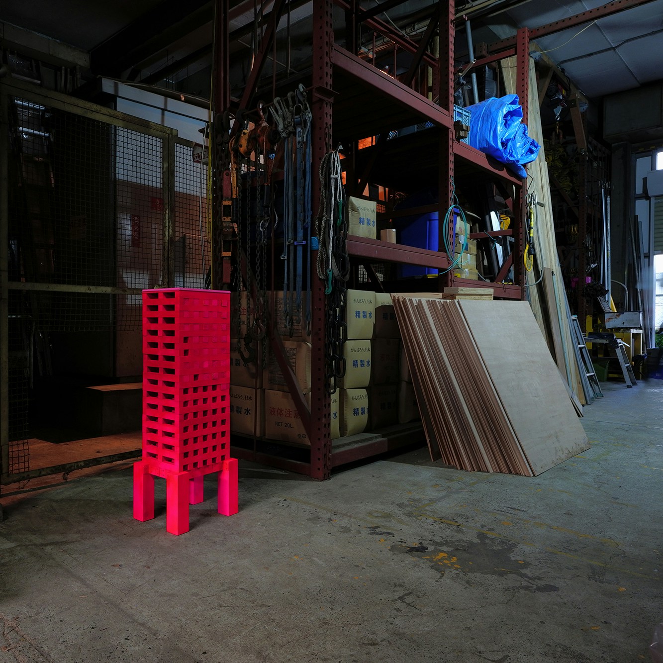 展覧会の締めは藤倉による映像作品だ。「会場」は通関業者が道具置き場として使用している事務所であり、古めかしい資材が積まれた一角を慎ましく間借りするかたちで2点の映像作品が展示されていた。映像作品には港湾の風景にインスピレーションを得たとおぼしきイメージが出現する。ピンク色のタイヤはオーバーヒート手前のマシーンのようにぶるぶると震え、カラフルなコンテナがオートマチックに動き、謎の導管が水中のような空間にネットワークを張り巡らせる。