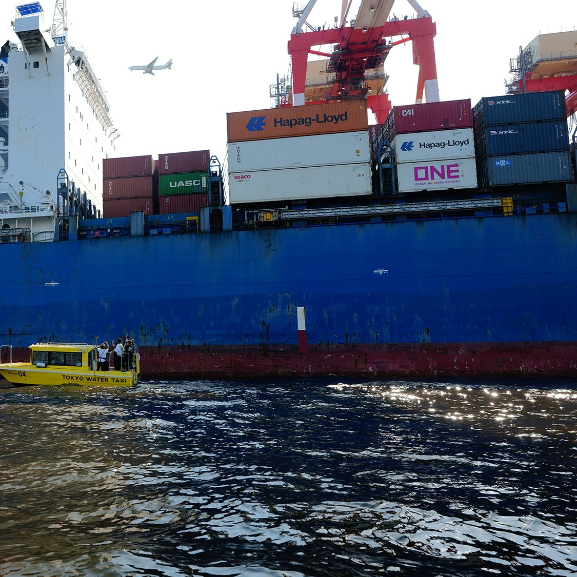 港湾風景のスケールが一段と増すのは船が物流拠点の埠頭に近づいてからだ。キリンのように長い首をもつガントリークレーンが何台も整然と並んでいる。色とりどりのコンテナがテトリスのピースを嵌めるかのようにスムーズに吊り下げされる。荷役作業の現場を仰角で眺める体験は、本展のハイライトといっても過言ではない。陳腐な言い回しになるが、何トンもありそうな重さのコンテナがこともなげに運搬される場面には、人間的なスケールを超えた物流業のダイナミズムを感じざるを得なかった。