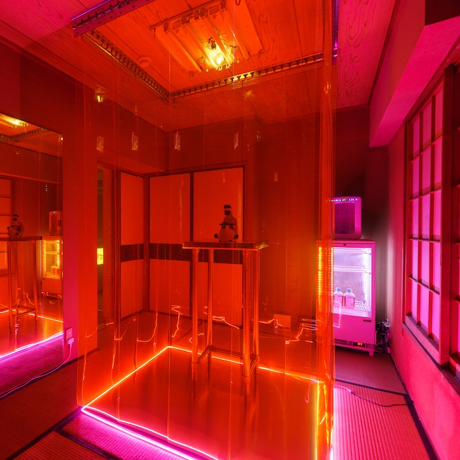 進むと、ピンクのライトで照らされた小宮りさ麻吏奈の部屋がある。畳の中央にシャーレがあり、顕微鏡越しにブルーに染まった細胞が美しい。じつはがん細胞で、それも70年以上前に子宮頸がんで亡くなったヘンリエッタ・ラックスに由来するという(*6)。小宮はまた、一般細胞を用いて描いた自身のポートレートを展示している。次の間でのピエール・ユイグの映像、廊下での展示(水場に企画・キュレーションを担当した渡辺志桜里の《水》(*7)、ミセスユキによる複数の平面作品)を経て、小さな戸を開けるといきなり能舞台となる。まるで冥界から生の世界に抜け出たかのように。
