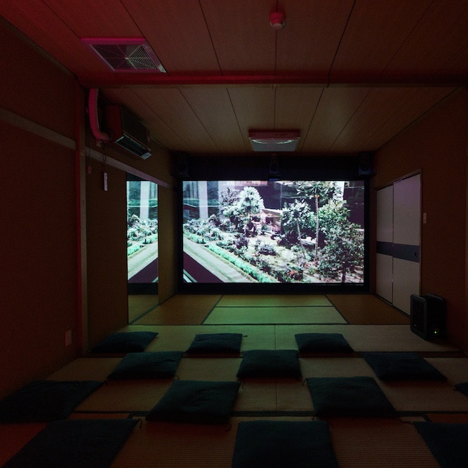 来場者がくつろげる空間には、コラクリット・アルナーノンチャイの映像、エヴァ&フランコ・マテスによる帰宅区難区域で撮影されたパターンによる壁紙や座布団とともに、昭和天皇の通称・人間宣言(1946年)やバイタルサインのデータ(1988年9月20日〜1989年1月6日、電光掲示板)が表示されている。そして空間内でもっともバイタルな役割を担ったのが《囲炉裏(火)》で、会期を通して人々が話し飲食をする舞台となった。