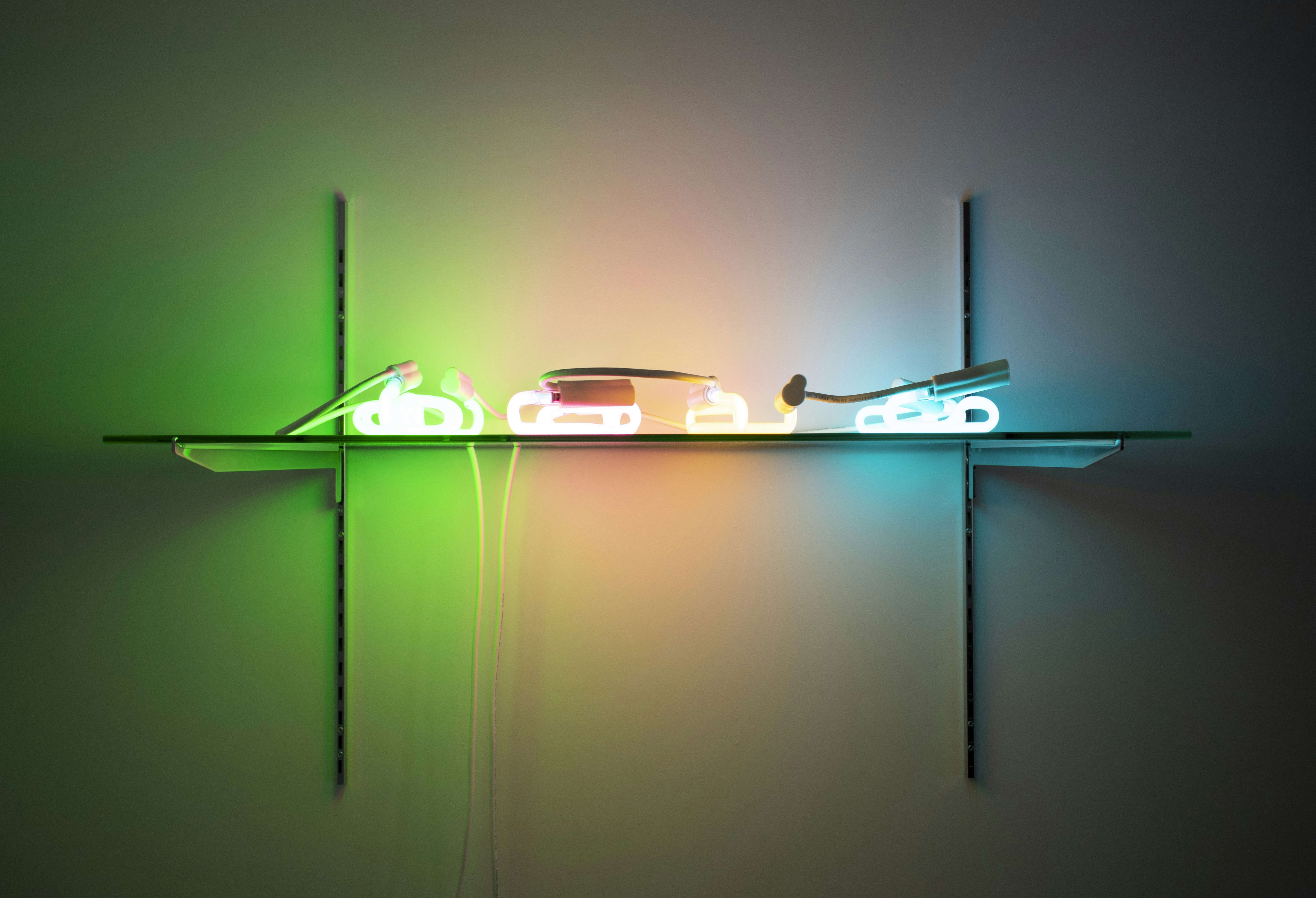Untitled: ¥ € $ £ 2023 neon tubing, glass, steel, transformer, and cord 150×76.2×35cm (c)Takashi Kunitani Courtesy of Ulterior Gallery, NY