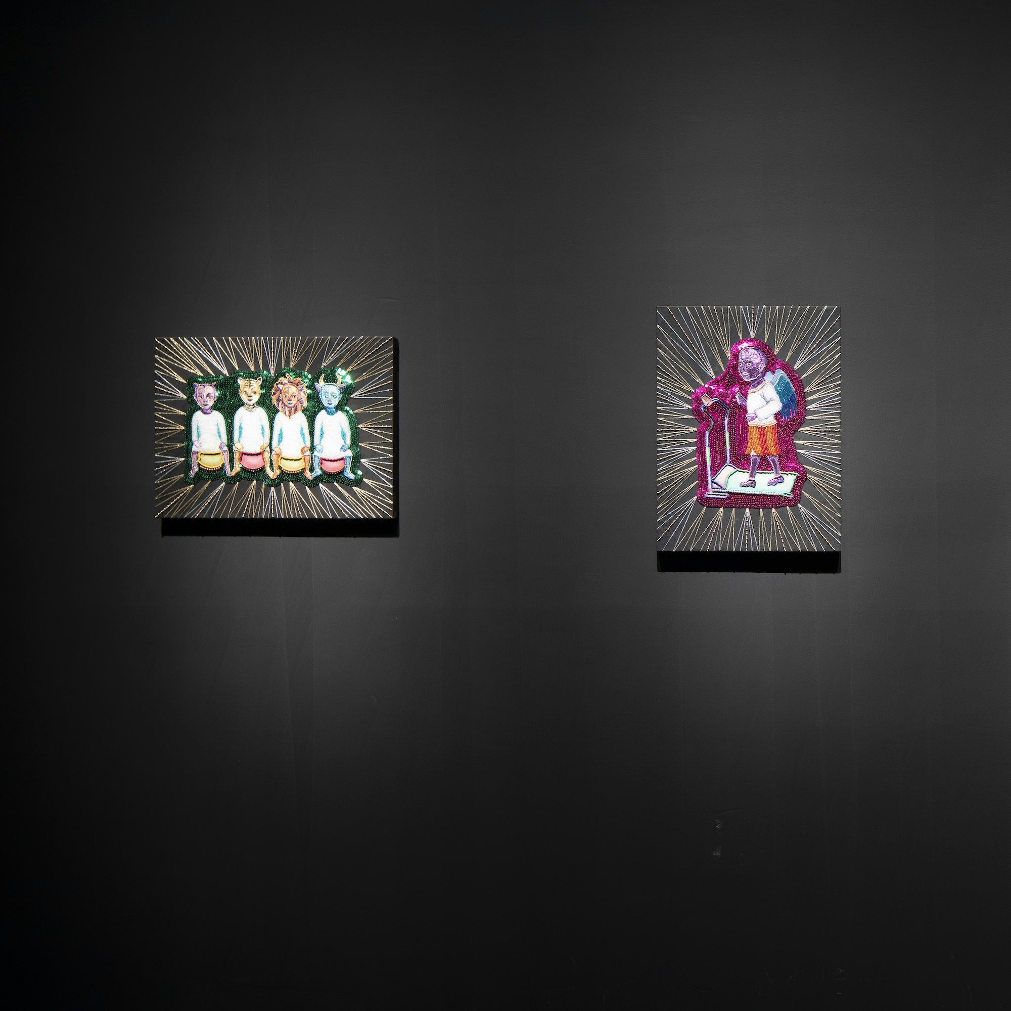 いっぽう、「Cosmos Cinema」まで一見かなり遠い作品群もある。例えば、笹岡由梨子のジャイロシリーズは、トレッドミルやバランスボールに乗る悪魔がスパンコール刺繍などで表現されている。解説文からは、東日本大震災の経験が制作の背景にあるということがわかるが、本展のなかでこの作品を理解するには、ロシア宇宙主義の神秘的な面を拡大解釈する必要があるかもしれない。