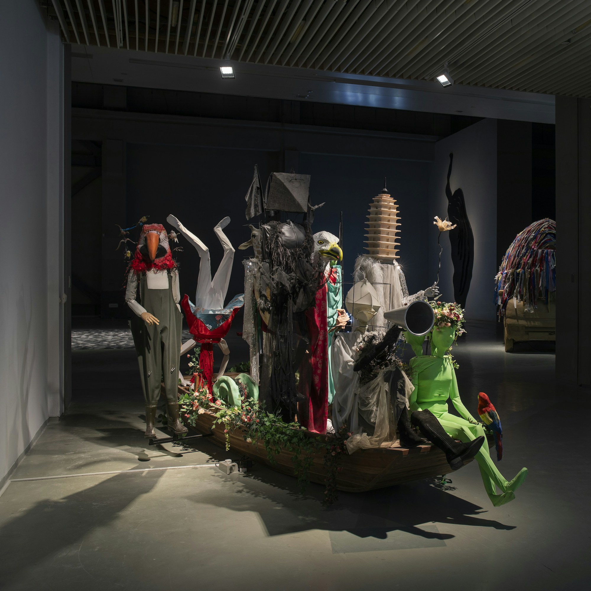 中国の神話の世界とヒエロニムス・ボスの地獄絵図を混ぜ合わせたような立体作品(動力があり、ブルブルと震えていて、おかしみを誘う)《Ship of Fools》(2018)と、浙江省南部ののどかな風景や荒廃した工業地帯を映し出す映像《Garden of Earthly Delights》(2016)で構成された周嘯虎(チョウ・シャオフー)のインスタレーションが目を引いた。