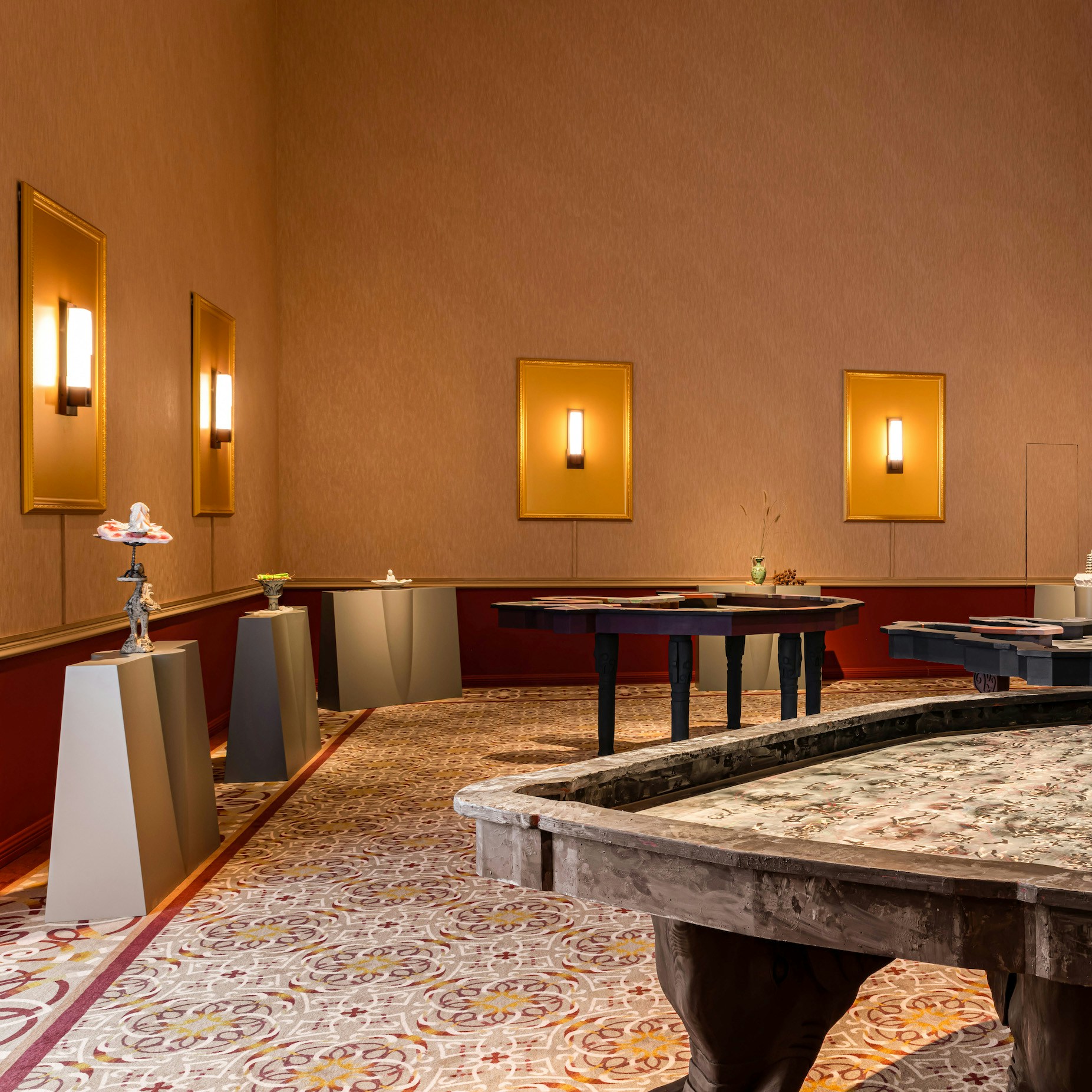 また、金融の世界に渦巻く時間・歴史・富のイリュージョンへと観客を誘う佩恩恩(ペイン・ジュー)《ポトラッチ・オブ・デリバティブ》(2023)は、豪華な中華料理のような立体作品を組み合わせ、高級レストランのような空間をつくり出した。食品と樹脂と貴石が入り混じったインスタレーションは、優美に盛り付けられた薄切りきゅうりの中に仏像が座っていたりして、見ているこちらの価値観がバグってくる、衝撃的な作品だった。どちらも土着の神話や宗教、風景や文物をモチーフに、現代の状況を描写する作品で、やはり「Cosmos Cinema」との関連を読み解くには精神文化や経済の流れを宇宙的なものとして敷衍させる必要がある。