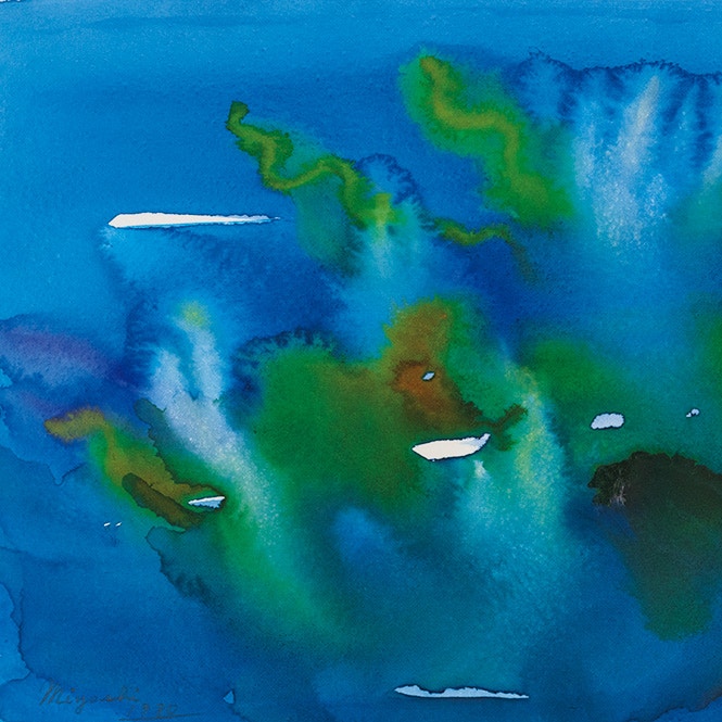 これらの鉛筆画と対照的なのが、その後、みよしが始めた水彩画である。これもまた鉛筆画と比して考えるなら、色だけの世界と言いたくなる。絵具が水で溶かれて紙に定着する。そのことが、みよしの絵の代名詞ともなったエーゲ海を旅した印象をもとに描いた海の連作ほど、端的に私たちの目の前に立ち現れたものはない。だからこの場合、エーゲ海というのはあくまで初発の目の入り口であって、その先にあるのはもっと純度の高い色の経験だ。事実、みよしの絵はエーゲ海を出発点にしていても、海をどのような角度でどのように映し取ったものかは判然としない。というより、そのような見方をするかぎり、みよしの海の絵は「海の絵」になってくれない。かといって──これが重要なのだが─みよしの水彩画の連作は抽象画というわけでもないのだ。それは、具象とも抽象とも、両者の折衷とも異なる枠組みでしかとらえることができない。そもそもカテゴリーが異なるのだ。強いて言えば、これらの絵を通じてわたしは、たったいま「水彩画」を見ている、という気持ちになる。そこでは、エーゲ海を水彩で描いた、のではなく、エーゲ海を通じて水彩画が見える、という逆転が起きている。しかも、それはみよしの水彩画を通じてしか絶対に見えてこない「海」なのだ。そのような「絵」に具象も抽象もありはしない。