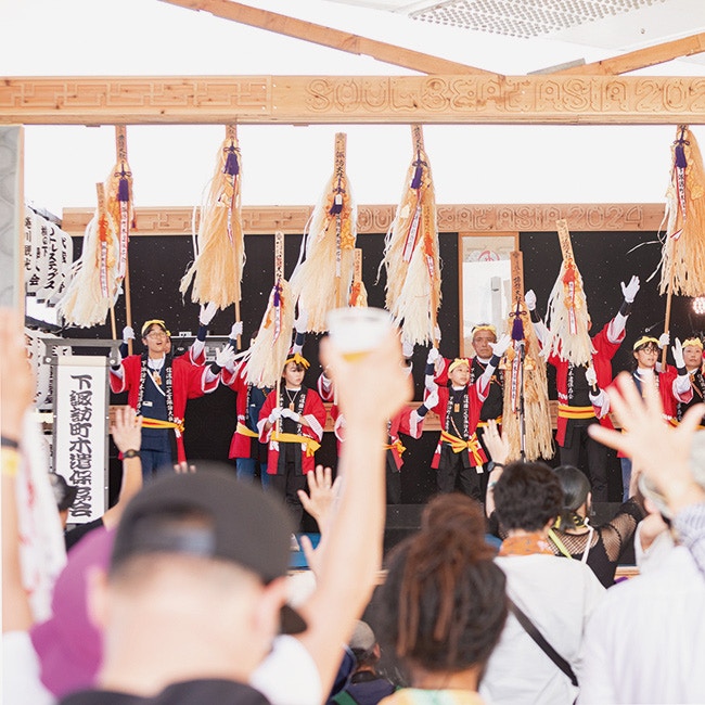 が、今回の「橋の下」でわたしがもっとも心身ともに揺さぶられたのは、中日の土曜夜、突然の豪雨で会場がぬかるみと化した後、「ピストルズ」と同じステージ「下町」に颯爽と登場した「珠洲ちょんがり保存会」だった。今回の「橋の下」では、能登半島地震の被災地から出張で地元の飲食や特産物を販売する「奥能登横丁」が設けられ、わたしも初日から能登の酒や肴を堪能していたが、今回披露された「珠洲ちょんがり保存会」による「ちょんがり踊り」の再現は、時間こそ限られていたものの、夜を徹して繰り広げられる様がありありと想像できる無際限な世界をつくり出していた。ここで「橋の下」の特設サイトで公開された同保存会からのメッセージを引用する。