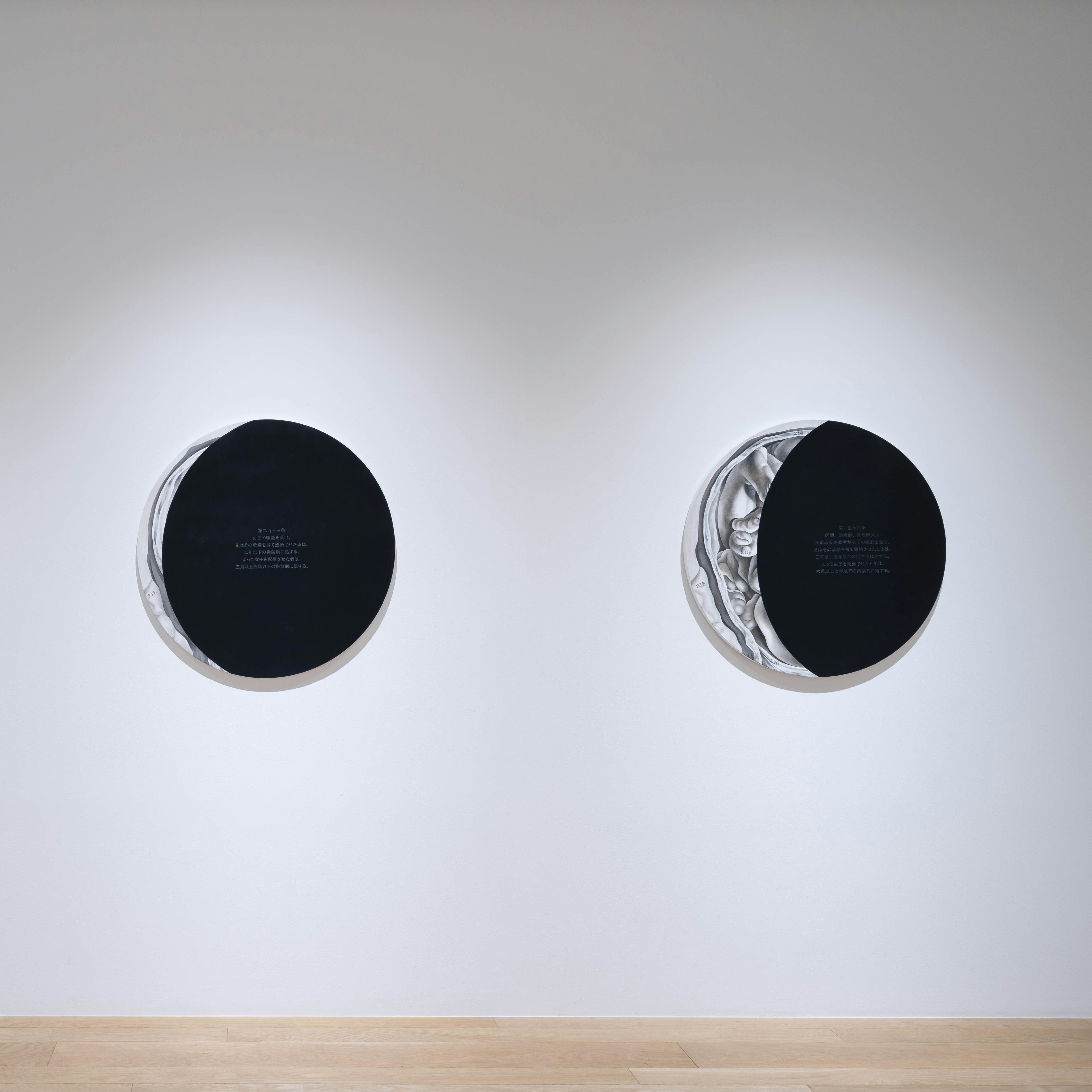 部屋の三方の壁面に6点の円型の作品が均等に配置されている。漆黒の宇宙のような黒く塗られた円型の作品は、三日月、半月、満月へと満ちていく。そして三日月型の表面から満月へと少しずつ露わになっていくのは、もちろん月面のクレーターではない。パールホワイトで緻密に描かれているのは、いまにも狭い円から這い出してきそうな、丸まった美しい裸の赤子である。少しだけ髪の毛が生えた大きめの頭部を下に、口の部分に小さな手がかかっていて、足は縮めて時計の11時の部分にある。あまりにも可憐な姿ゆえに、この子が臨月に死んだ母親の子宮にいる子供だと気づいた瞬間に、一気に周りの空気が凍りつく。この子は本来ならば人の目にふれられる存在ではないのだ。