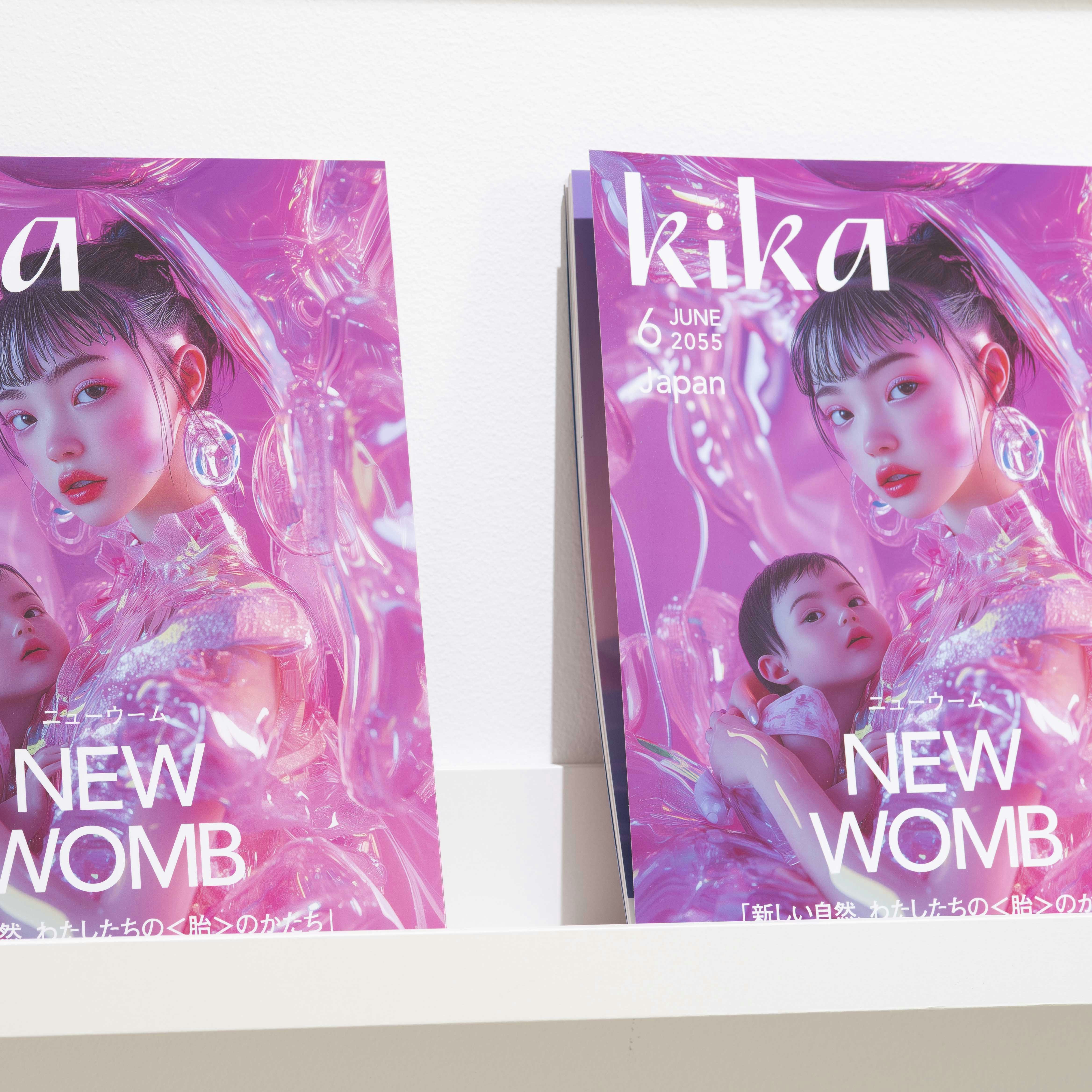 みょうじなまえは30年後の近未来の妊娠・出産シーンをつくり出した。展示されているのはすべてAIによってつくられた写真や映像だという。ファッション誌のような体裁の雑誌『kika』には、未来のファッションとともに、特集「NEW WOMB 新しい自然、わたしたちの〈胎〉のかたち」のインタビューが掲載されている。性別や年齢を問わず人工子宮によって妊娠・出産ができるようになったにもかかわらず、お腹の中にわざわざインプラント型人工子宮を入れて出産する女性が増えているのだという。「痛みこそが愛情の証拠であり、苦しみこそが母性の真正さを保証する。そんな空気が、少しずつ、じわじわと、わたしたちの世界に広がりはじめている」(*7)。