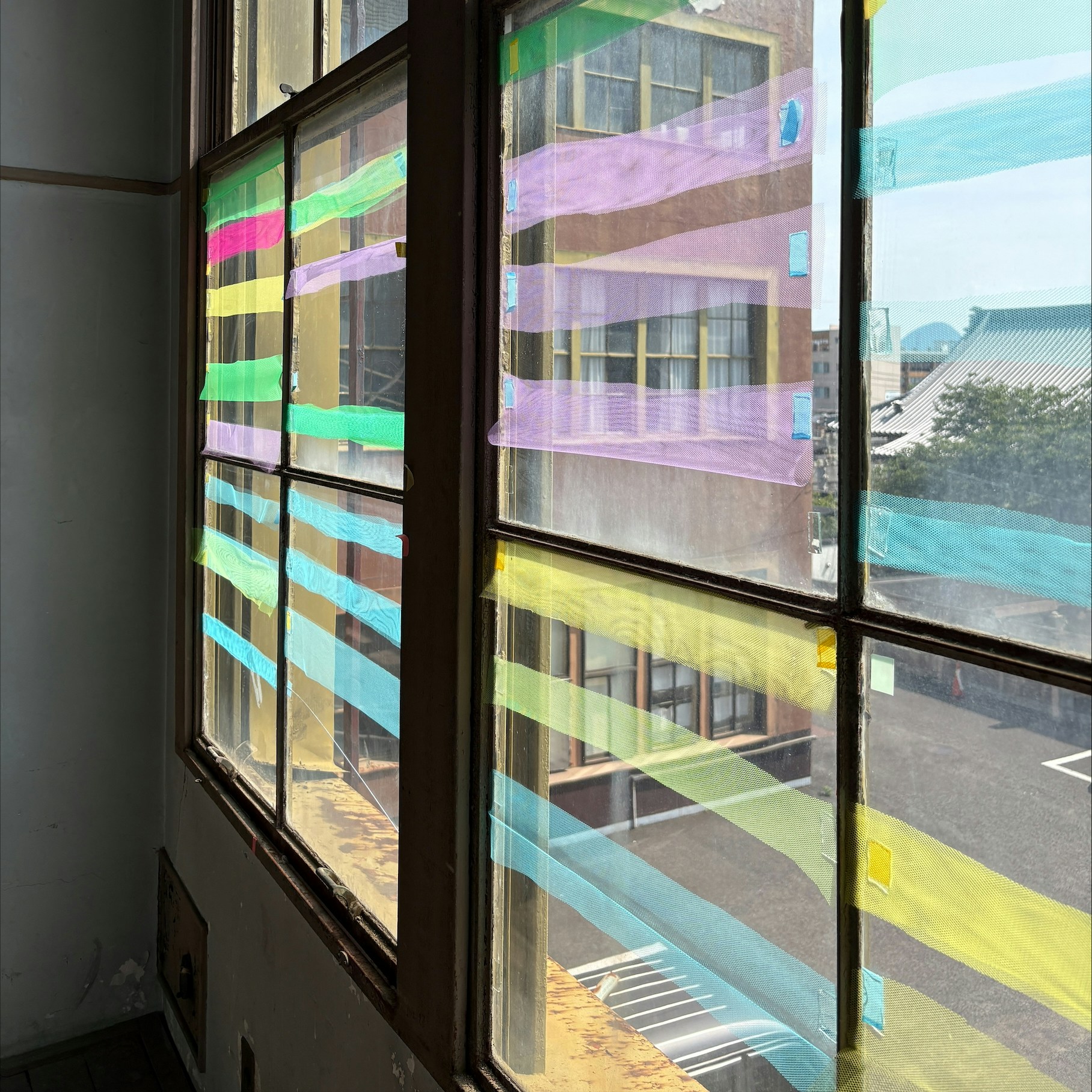 筆者に同行していた友人は、杉戸洋の《12年越しの風景》(2025)を目にしたとき、そう口にした。本作は、細長く切ったチュールの布をテープで窓に貼り付けた簡素なつくりのインスタレーションだ。それを建物の落書きだと誤解し、「ずっとここにあった/ある」ものだと錯覚したこと自体が、作品が過去と未来の両方に開かれた感覚を呼び起こしたことを物語っていた。