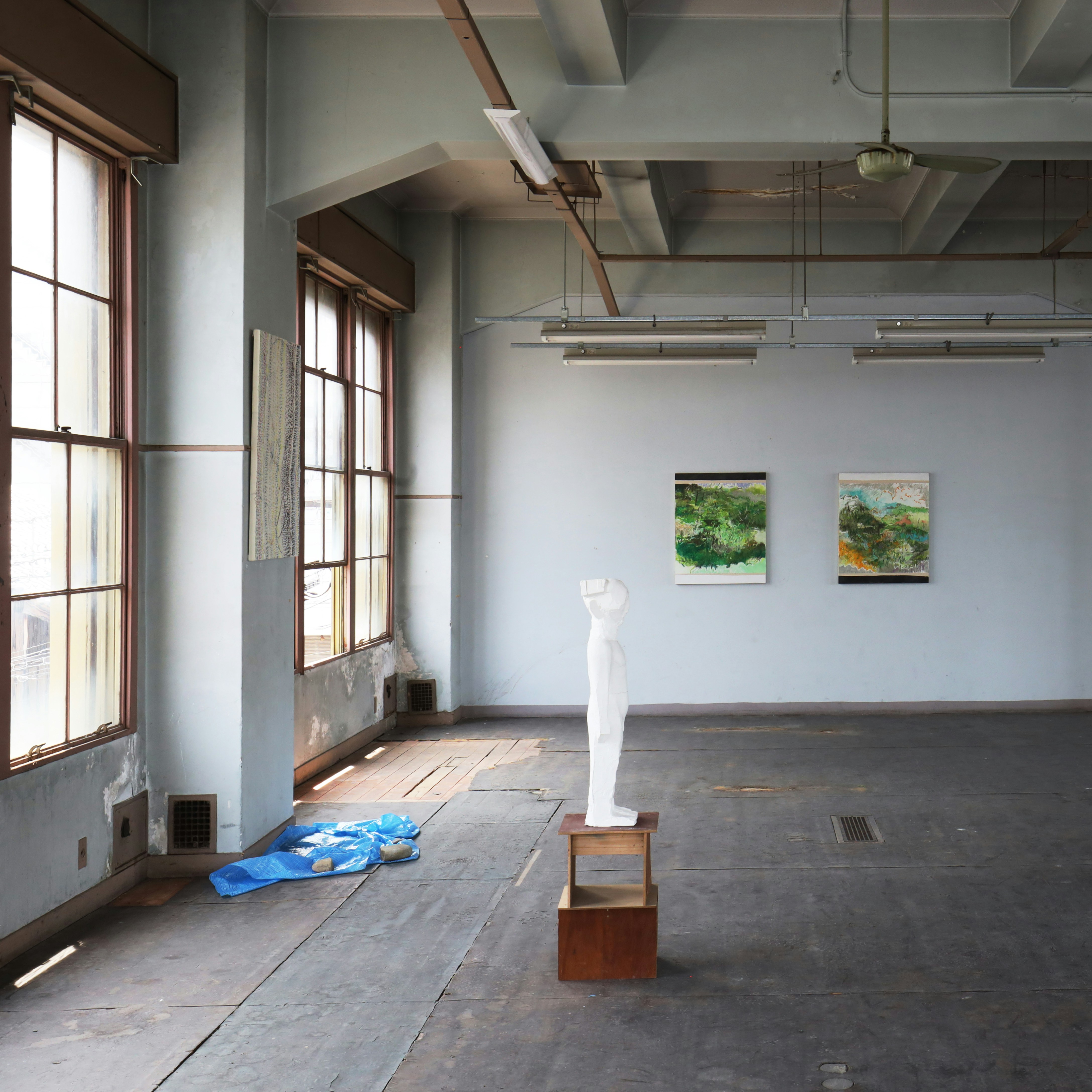 三方に窓がある会場は、スポットライトこそないが、採光に優れて広々としていた。リノベーションされていた竹崎のスタジオとは異なり、このスペースは長年放置されていたと見え、所々に発生した壁の塗装剥がれや床のひび割れが年月の経過を伝える。