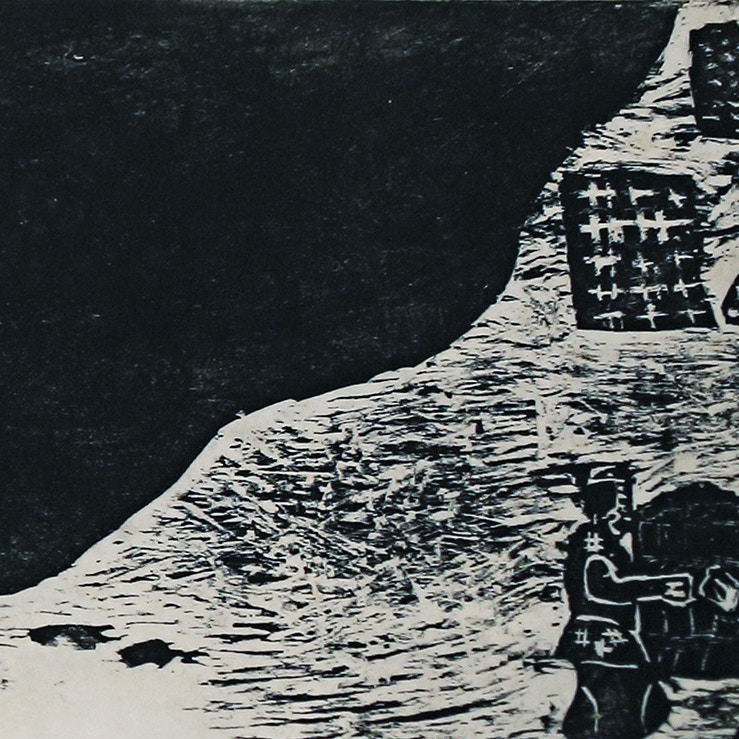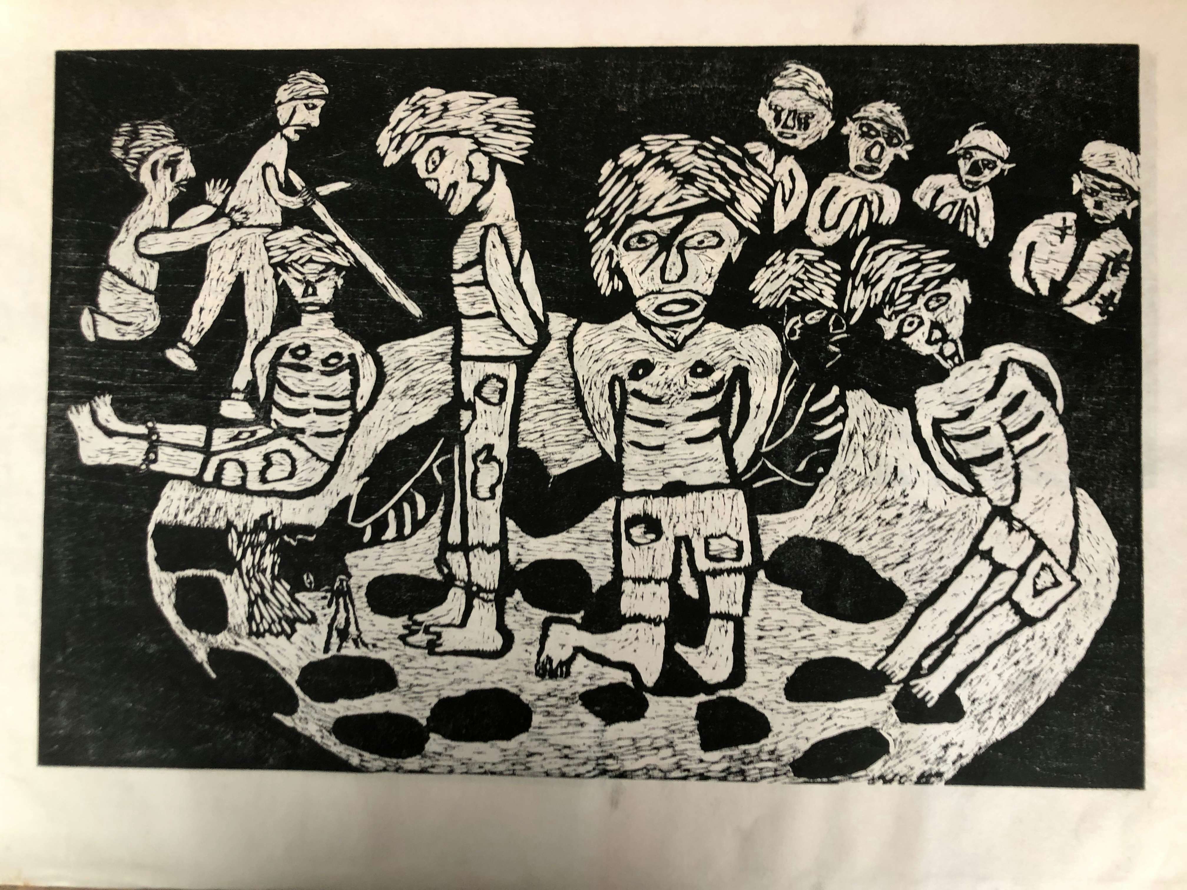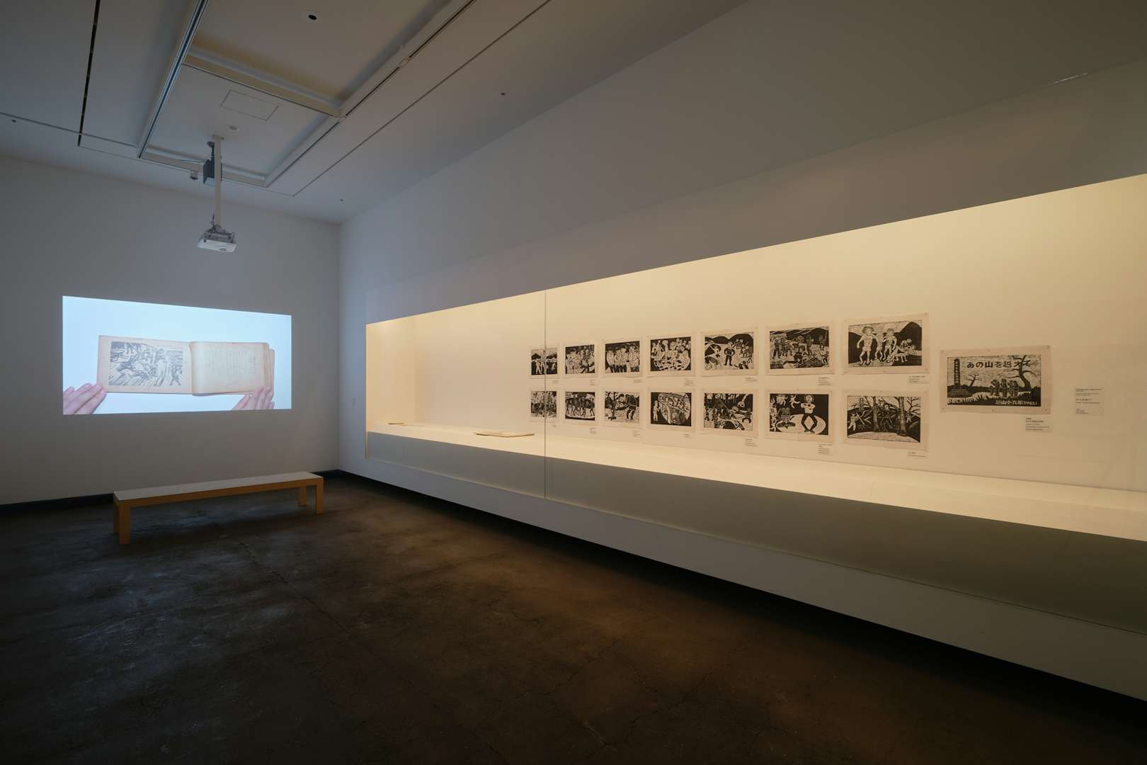 展示されていた《あの山を越えて》(1983)は、越山小学校の6年生14名が教員・庄司時二の指導のもと、事件から40年ほど経ち忘却されつつあったこの花岡事件と向き合い制作した連作版画だ。山ひとつ隔てた花岡で約40年前に起きた惨事に衝撃を受けた子供たちは、当時を知る祖父母への聞き取りを行い、得られたエピソードを組み合わせてひとつの物語を構成した。