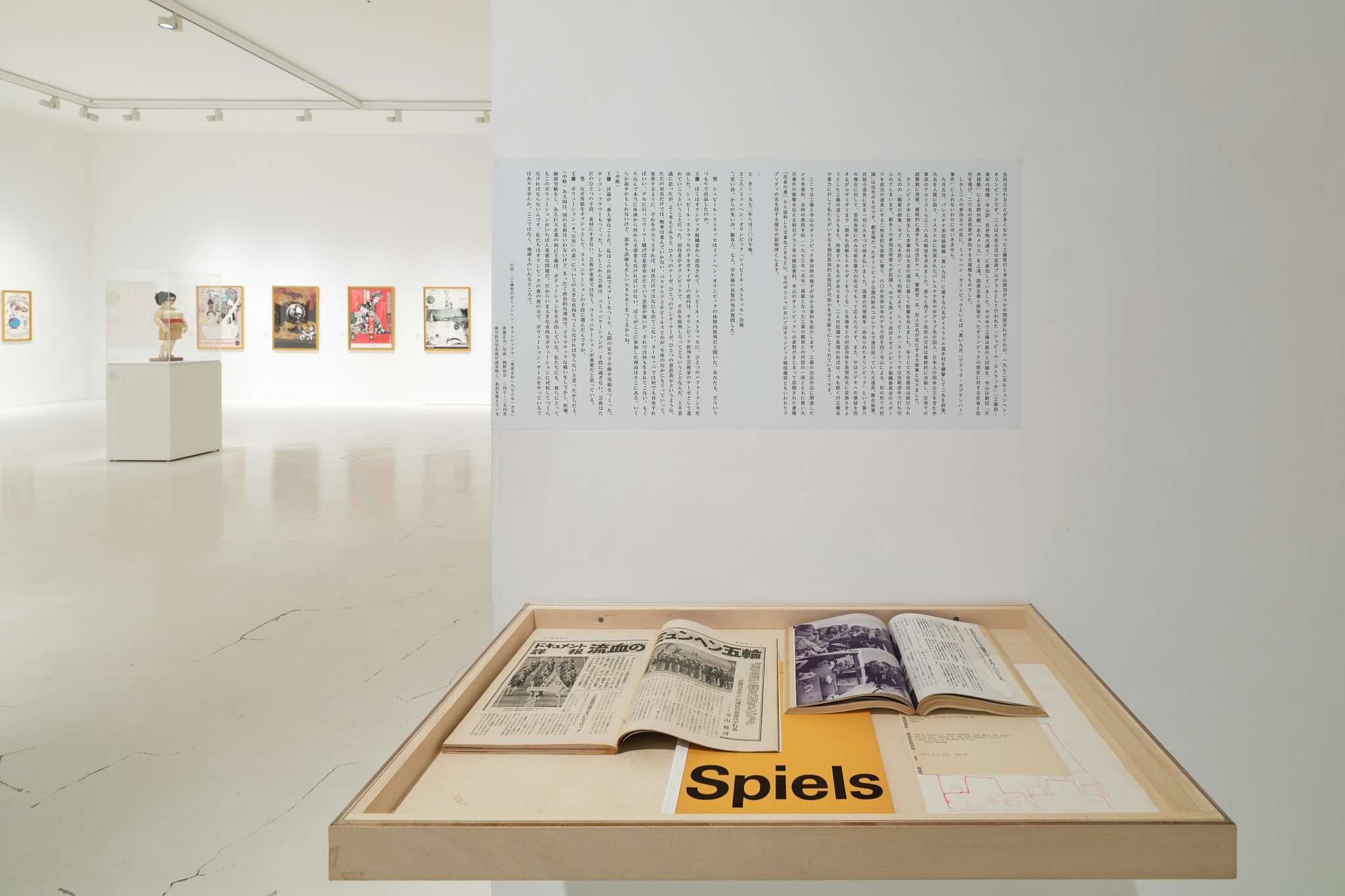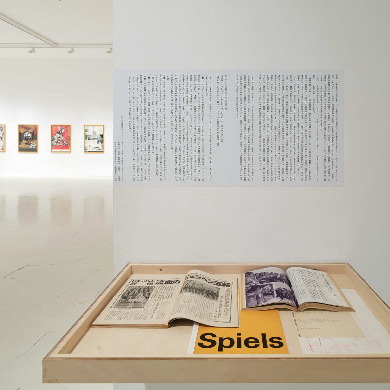 この展⽰室では、⼯藤哲⺒と寺⼭修司の2⼈が参加した1972年のミュンヘン・オリンピック公式芸術プログラム「シュピール・ストラッセ」の様⼦を伝える資料が紹介されていた。総勢26名のアーティストが参加したこの企画は、オリンピック期間中に発⽣した事件「Black September(黒い9⽉)」(*1) の影響により、会期途中で打ち切られた。本展では、様々な対応をした数多くの参加者のなかから⼯藤と寺⼭に焦点を当て、2⼈の対応を⽐較して紹介していた。