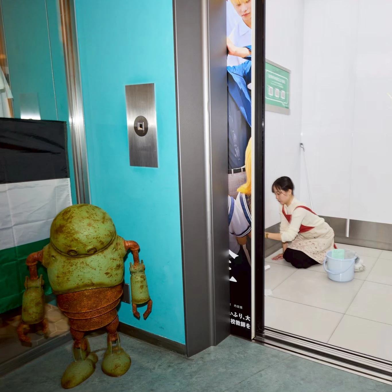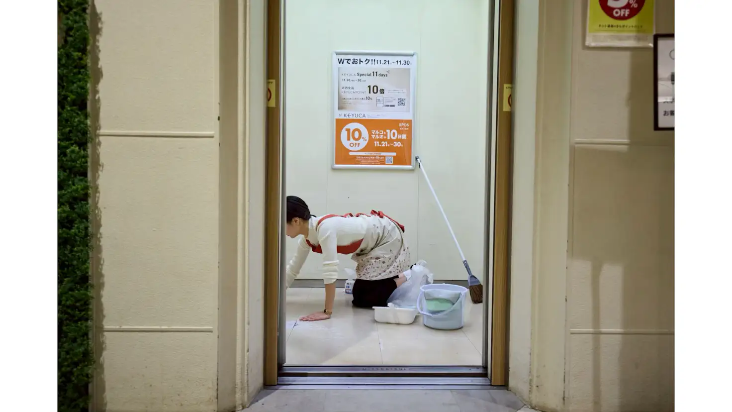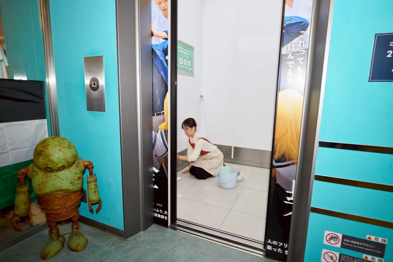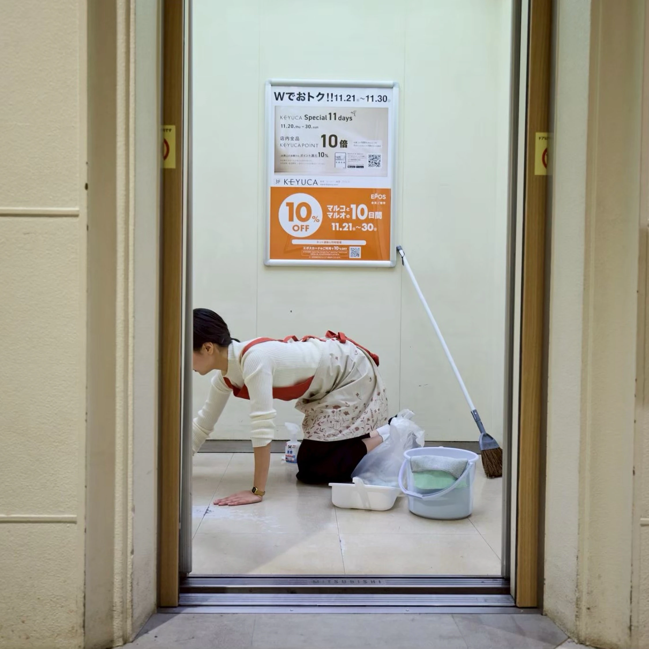 それらしき場所に着き、ボタンを押して少し待つ。エレベーターが到着し、扉が開く。するとそこにいたのは、掃除をする1人の若い女性だった。はっきり清掃員だと分かるユニフォームではなく、普段着にエプロンという格好だ。家事を思わせるラフな装いで、商業施設の清掃員としては違和感があるが、そういう職場環境なのだと考えれば納得できなくもない。彼女は、床や外壁の掃除にひたすら没頭していた。こちらを向き、顔をはっきりみせることはない。