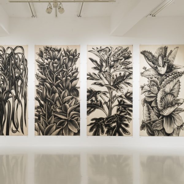この絵を見たときに受ける一種異様な感覚は、画面から生命の気配がまったく感じられないことによる。むろん、絵といっても板に木炭を擦り付けただけなので、画面で命が躍動しているように見えたほうがむしろ変なわけだが、それにしても木や草、花を描いている以上、生命の気配が皆無というのはおかしなことだ。この印象は、植物が繁茂しているからには土があり、空気があり、風の流れがあるはずにもかかわらず、それなら本来、描かれてよいはずの生き物の気配がすっかり消されていることからきている。(図録での宇川直宏との対談で虫に言及しはするが)。例外的に木に生えたキノコ(菌類)が描かれてもいるが、花の交配を進める蝶や蜂、枯葉を住処とする甲虫やミミズ、それらを餌に森を飛び交う鳥たちの姿はここにない。ひと気がないだけではない。この絵の中の景色は生態系が壊れている。
