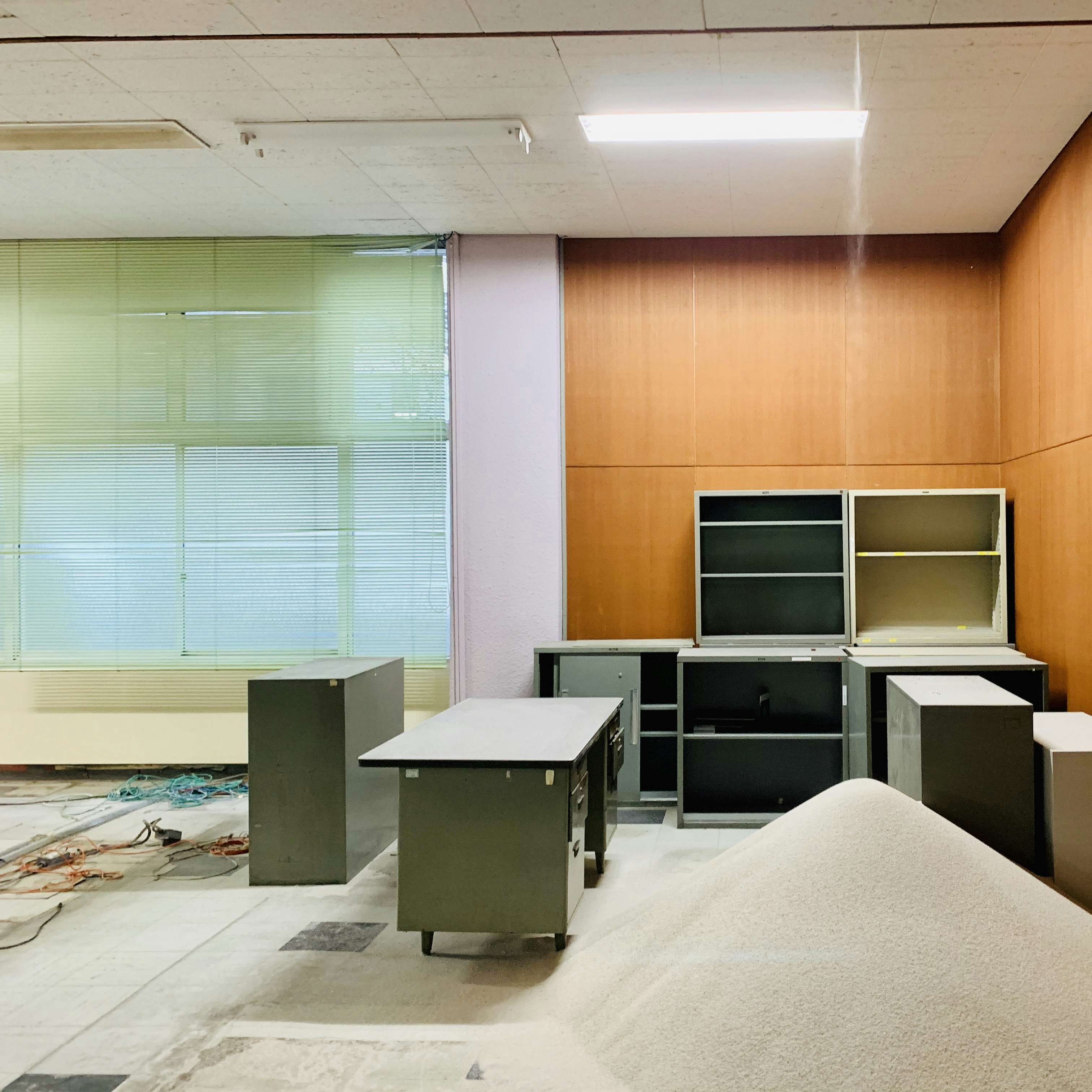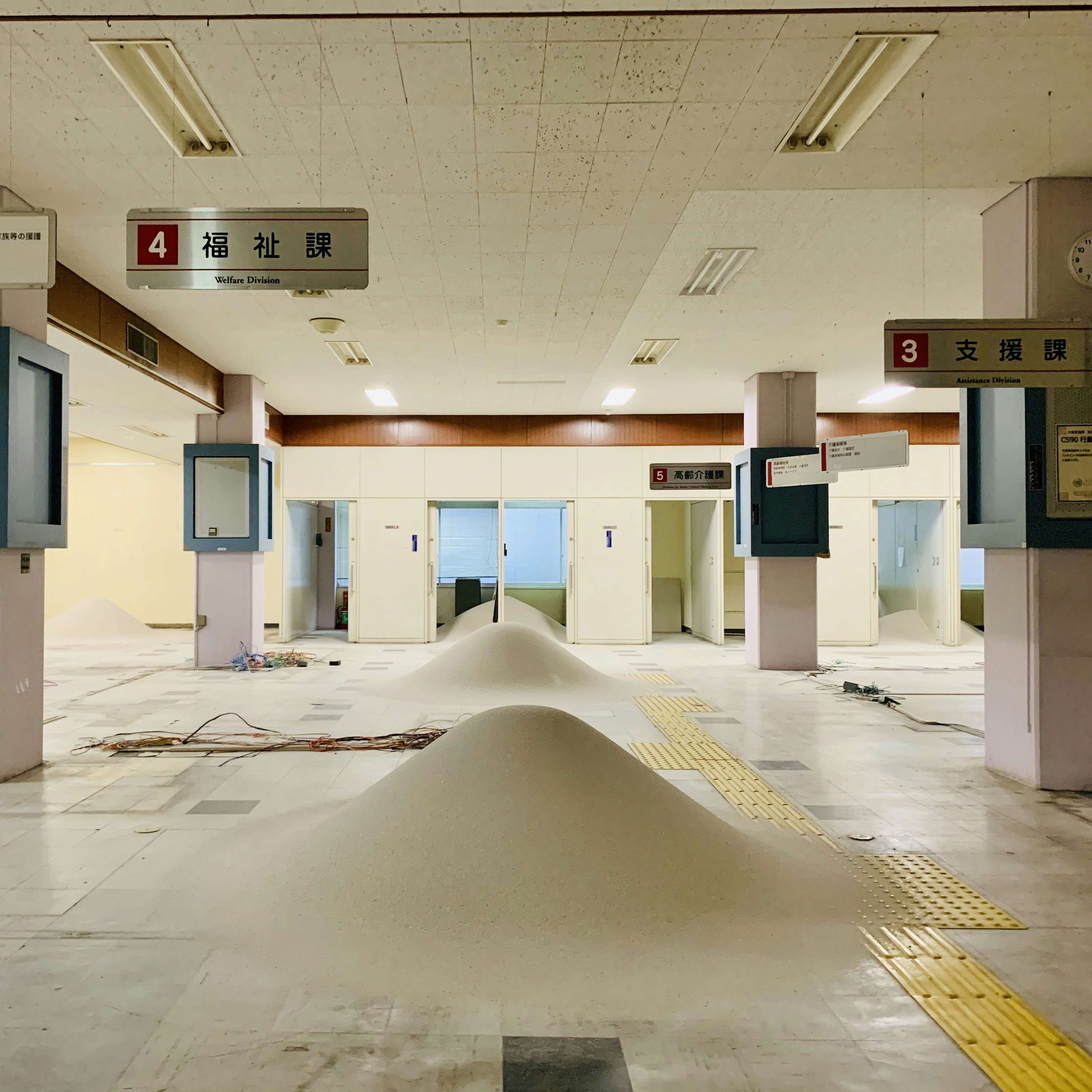 長く「区役所」としての機能を担い、まだその空気が濃厚に残る建物内で展示を行うアーティストは19組。与えられた展示スペースも贅沢な広さで、「個展」と言えそうな規模と幅のインスタレーションを展開した作家も少なくない。なかでも、「福祉課」「支援課」「高齢介護課」と記されたサインが天井から吊り下がる1階フロアに展開された、篠田太郎のインスタレーションは印象的だった。天井のあちらからひと筋、こちらからひと筋──と音もなく砂が降り注ぎ、廃棄された電気コードが這い回る床のそこかしこに、小さな砂丘が育っている。相談用にと仕切られた個室では、壁に立てかけられたホワイトボードが砂に埋まっていた。「自助・共助・公助」というかけ声の響く今この時、音もなく降り積もり、世界を埋めていく砂を、現実の世界で意識することは難しい。