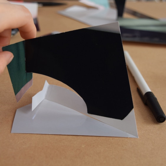 そのうちに、このパネルを伸ばしてみれば、それが一つの平面をなすだろうことに気がつく。ここをこうして、あそこをこうすれば......雑作もなくそれが平たくなったところを想像できる。なかにはそこからはみ出してしまうドレープや折れ目もあるようだけど、ともあれ正方形の平面が仮想的にできあがる。どうやらこの正方形は写真を撮るときのフレーミングのように事後的に与えられたもののようだ。
