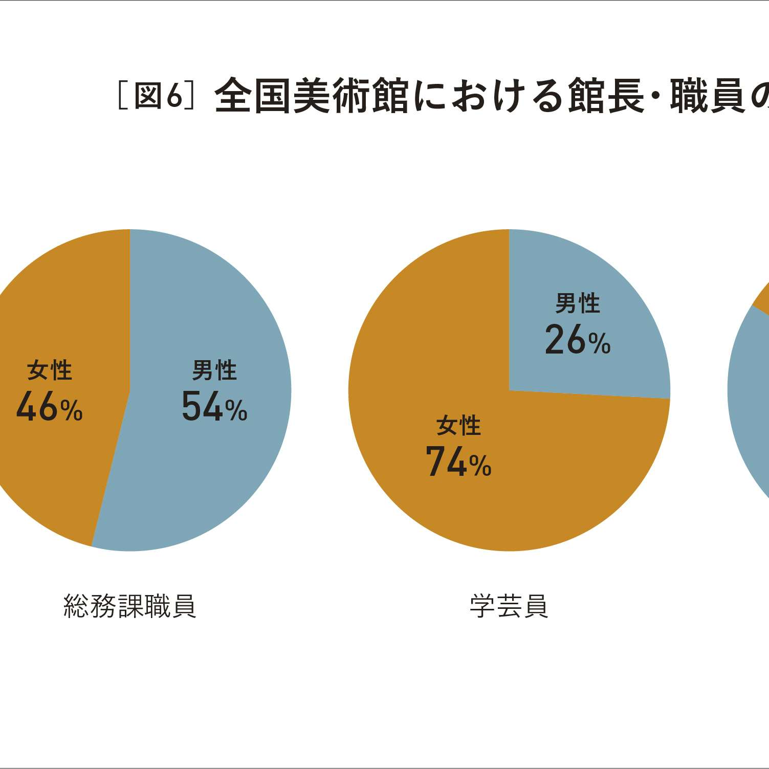 次に全国美術館55館(国公立、私立、独立行政法人すべて含む)における館長、学芸員、総務課職員の男女比を分析する(図6参照)。データは2019年2月にアンケートによって取得したものである。興味深いのは総務課職員の男女比がもっとも均等に近いが、学芸員は女性比率が74パーセントとかなり大きくなっていることだ。さらに館長になると男性比率が84パーセントと、学芸員と比べても男女差が大きくなり、また比率が逆転していることである。全国的な現象であるが、末端には女性比率が大きく、地位が高くなると男性比率が大きくなる傾向が表れている。比較対象として十分ではないが、日本の主要企業におけるCEOの女性比率は、5パーセント以下である 。しかし、学芸員の女性割合の大きさを考えれば、館長クラスのジェンダー比率も再考すべきであろう。ここにも、女性のキャリア形成をめぐる障壁が存在することが指摘できる。