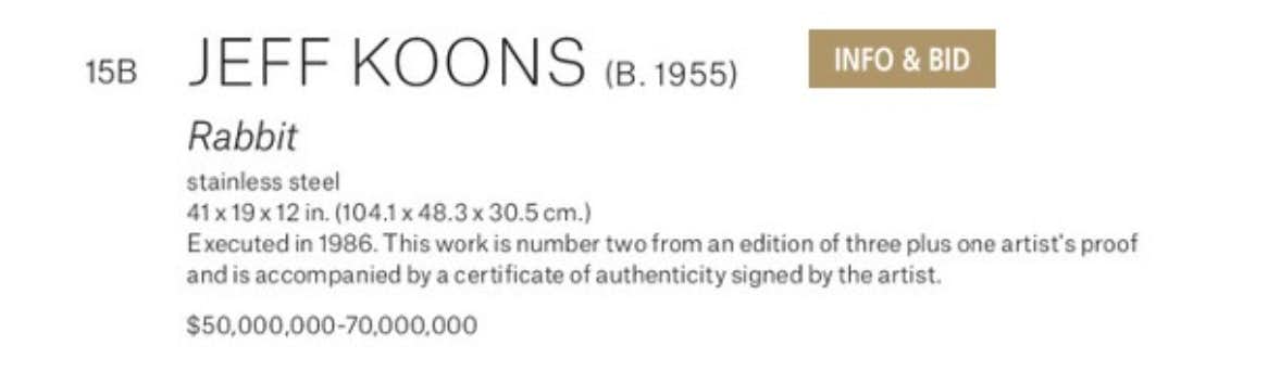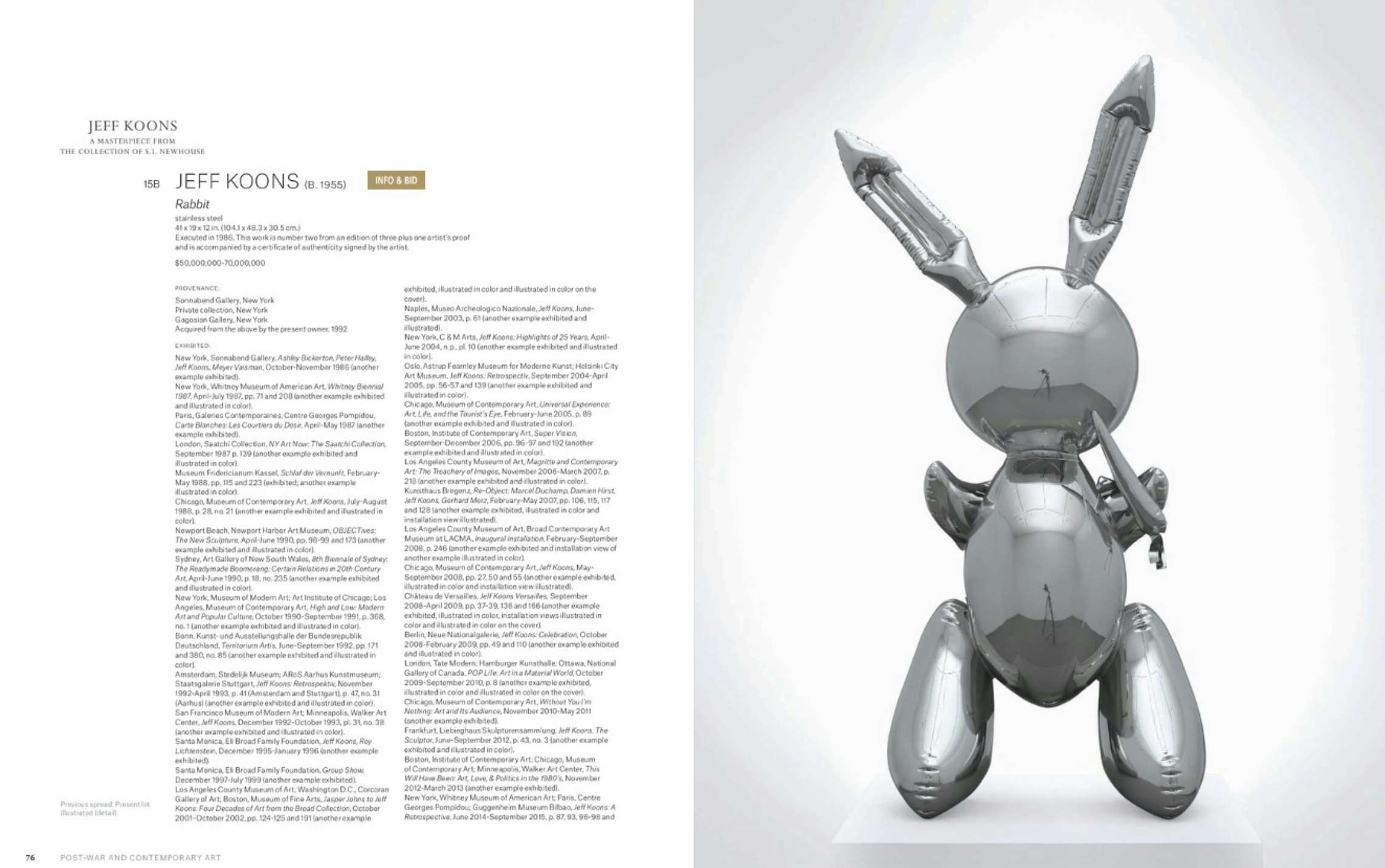 ジェフ・クーンズ《Rabbit》の出品ページ 出典=クリスティーズ・ニューヨーク Post-War and Contemporary Art Evening Saleカタログ(2019年5月15日開催)76-77頁