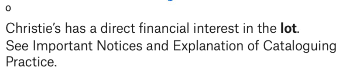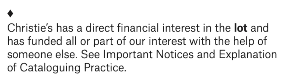 筆者訳:クリスティーズは、ロットについて直接的な金銭的利害関係を有しています。また、クリスティーズの利害関係の全部または一部の資金を他者の援助により賄っています。カタログプラクティスの重要なお知らせおよび説明をご参照ください。 SYMBOLS USED IN THIS CATALOGUE 出典=クリスティーズ・ニューヨーク Post-War and Contemporary Art Evening Saleカタログ(2019年5月15日開催)347頁