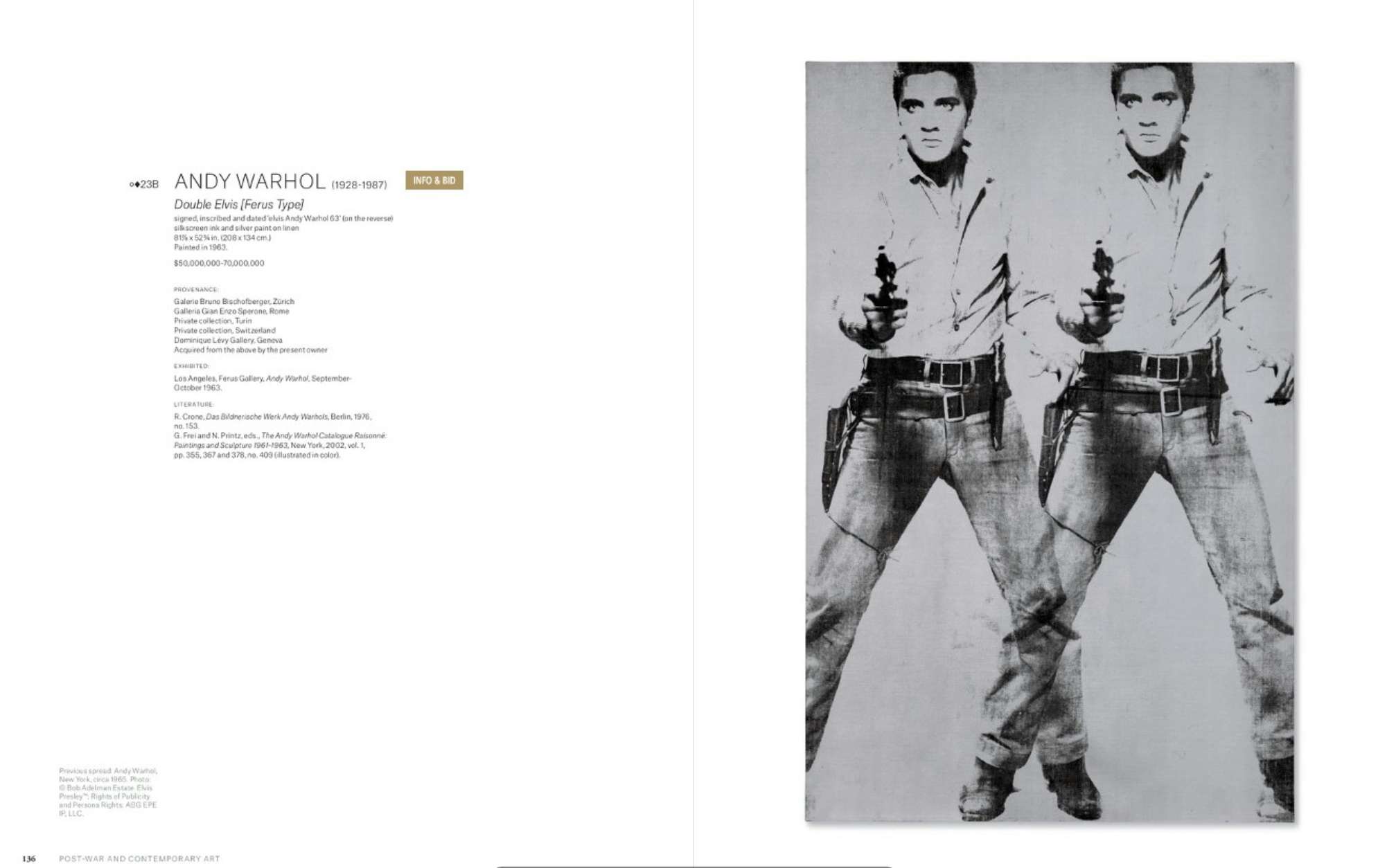 アンディ・ウォーホル《Double Elvis [Ferus Type]》の出品ページ 出典=クリスティーズ・ニューヨーク Post-War and Contemporary Art Evening Saleカタログ(2019年5月15日開催)136-137頁