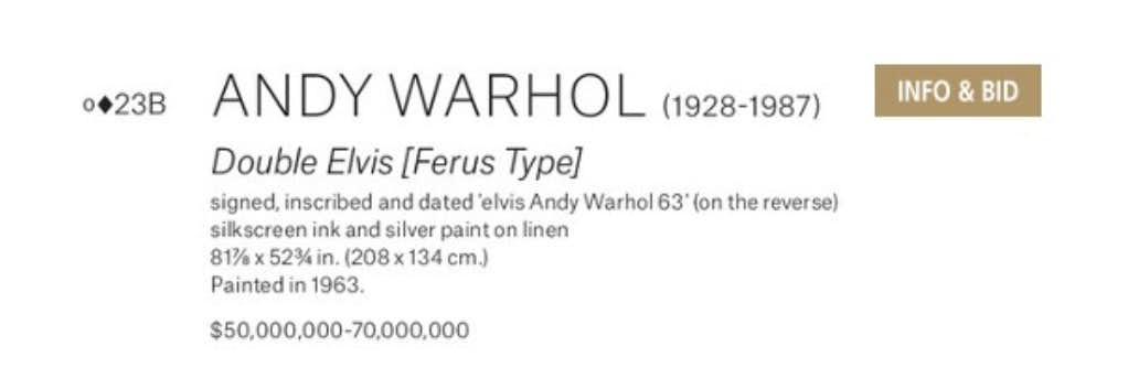 アンディ・ウォーホル《Double Elvis [Ferus Type]》のロットナンバー23Bの隣には白丸に加えてダイヤのような印が付けられている 出典=クリスティーズ・ニューヨーク Post-War and Contemporary Art Evening Saleカタログ(2019年5月15日開催)136-137頁