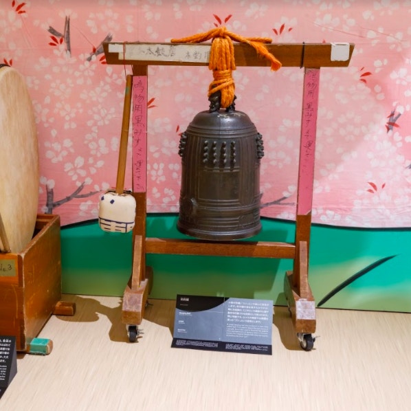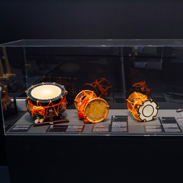 第5章は「雅楽」は、西国の人が蛇を求め得て喜ぶ姿を舞にした『還城楽(げんじょうらく)』をマネキンで再現。正式な舞楽で用いられる高さ5メートルの巨大な「鼉太鼓(だだいこ)」を設置する。