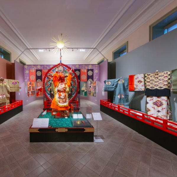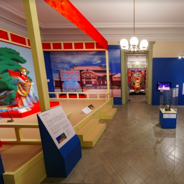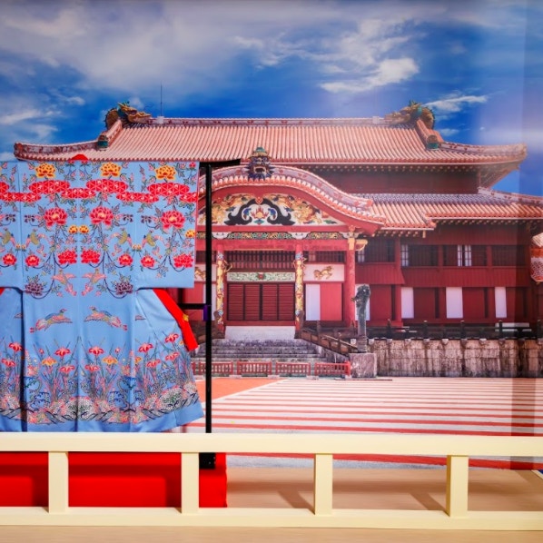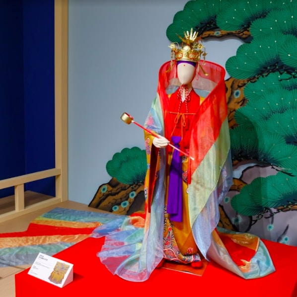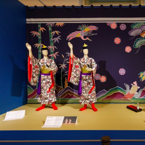 第3章は「能楽」。能面と縫箔(ぬいはく)の豪華な装束に、長絹と初冠を着けた姿を、世阿弥の能を代表する『井筒』の舞台で表現。自然を写す草花の模様を取り入れたデザインを見ることができる。第4章は琉球王朝の音楽劇「組踊」を取り上げる。首里城正殿の御庭に設置された、御冠船芸能の舞台を再現するとともに、沖縄の故事にある天人女房譚に取材した組踊『銘苅子(めかるしー)』の天女を立体的に展示する。