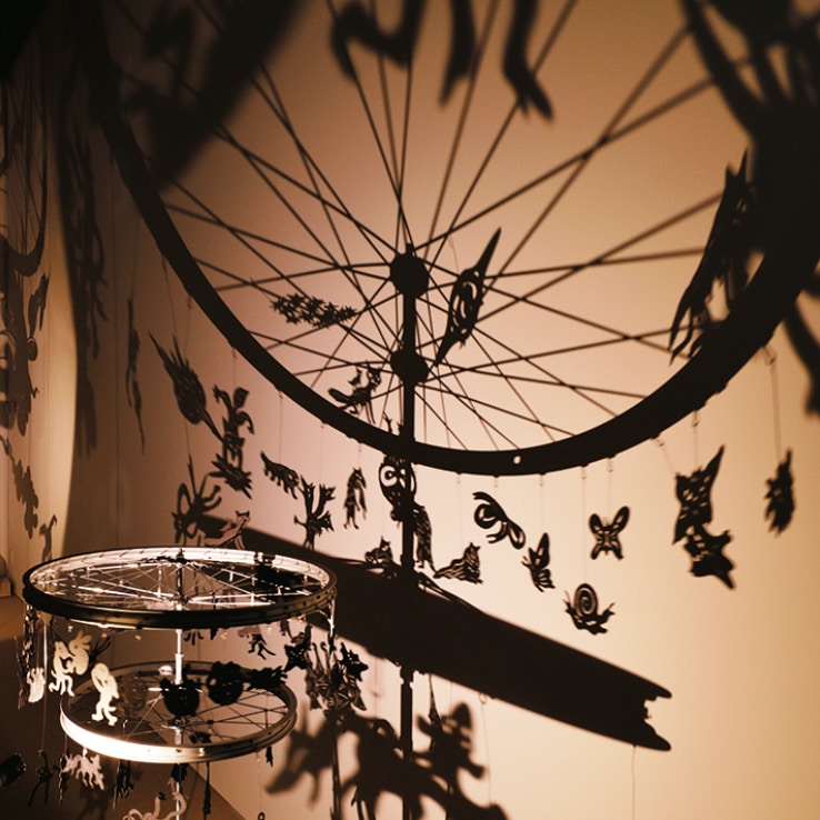 だが、それだけではない。鴻池によると、会場を造営する際、もっとも配慮したのが照明だという。会場の高さがそれほどないので天井からの照明だと光源が鑑賞者の目に障るし、天井がすべて黒いので下から照明を当てるとギラギラと反射してしまう。そこで鴻池は自作の照明を鑑賞者の視線に入らない位置に設置した。これについて、鴻池はこう言う。