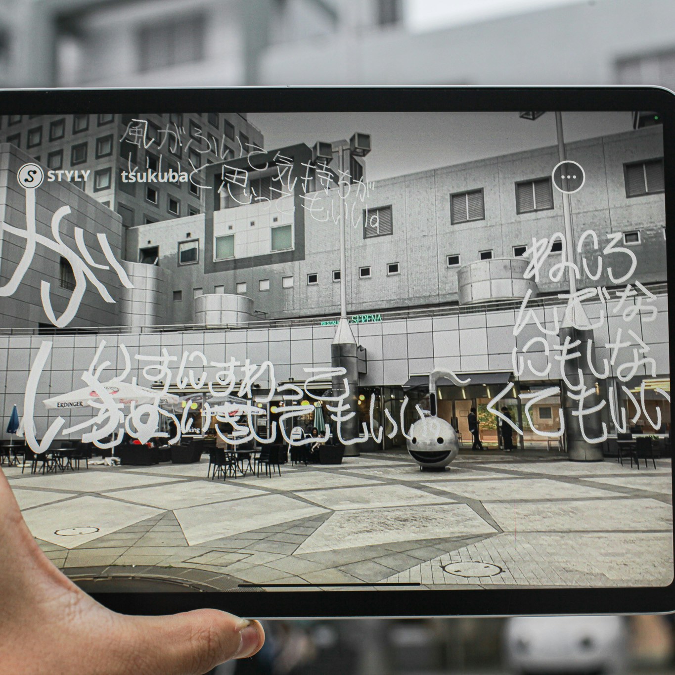 つくばセンタービルに関心を寄せていた光岡さんは、当初自身が過去に行ったパフォーマンス《通達》(2021)の再現を予定していました。ですが、デモ活動に見えるという理由でつくば市からの許可が降りなかったんです。そこでARの技術を使って広場に見えない文字を書くというアプローチに変更しました。書かれているのは「ねころんでなにもしなくてもいい。」など、たわいもないことを許可していく言葉の数々です。