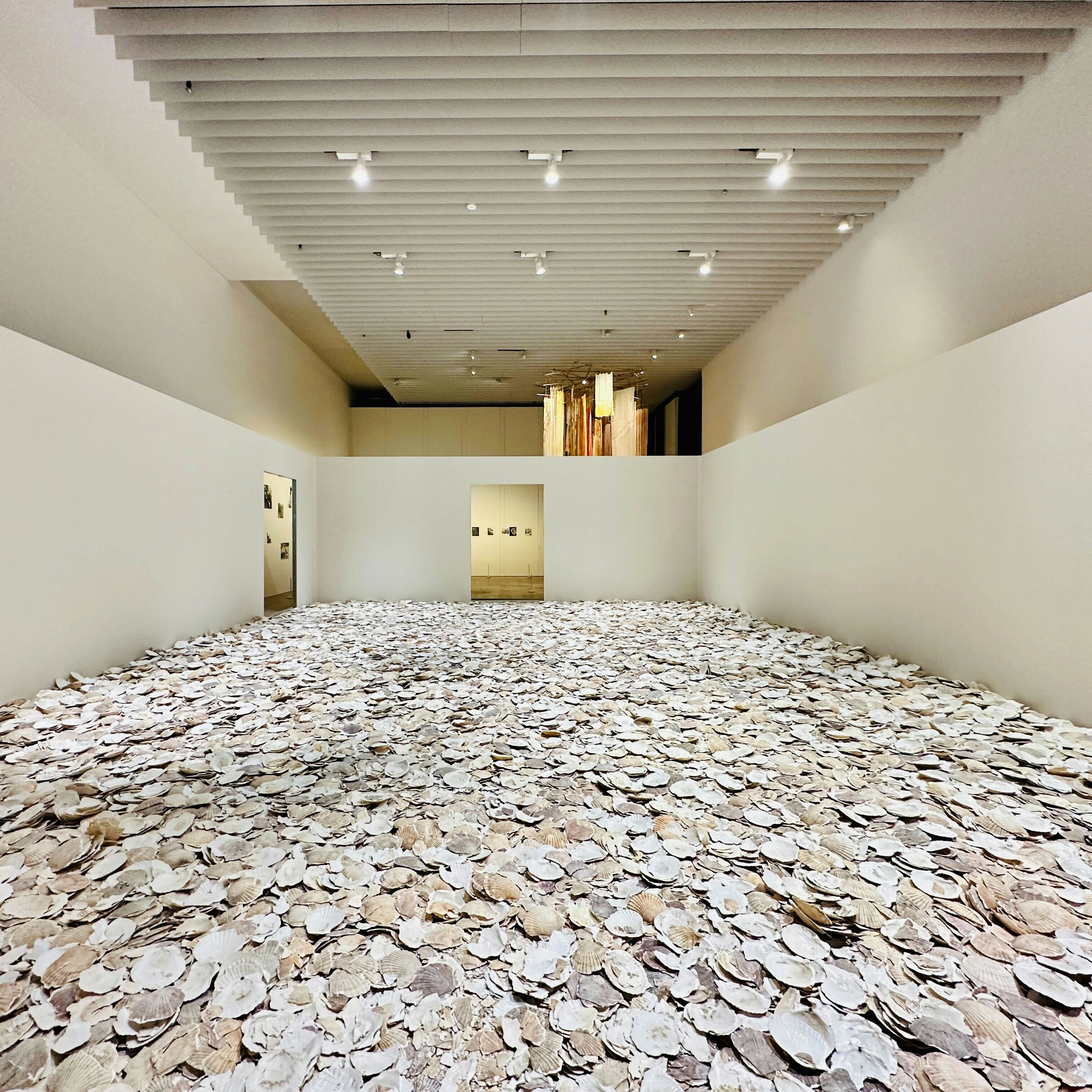 エコロジーと経済というトピックは、ニナ・カネルの彫刻インスタレーション《マッスル・メモリー(5トン)》(2023)においても共鳴している。北海道産の(ベトナムからの移民の人々によって洗浄された)5トンもの貝殻が、来場者の足で粉々に砕かれ、建築産業用のコンクリートへと生まれ変わる。ある種、軟体動物たちによってつくられた小さな建物である貝殻のひび割れの一つひとつが、東京の中心にある森タワーという、比べ物にならないほど大きな人工建造物の壁にエコーされている。ここまでに「周縁」地域における影響を述べてきた地球規模の環境危機は、日本においても認知されているが、つねに去ることのない地震の脅威による「安全」志向の陰に隠れている。それはさらに、声を上げる人が足りないということでもある。屋外が年々暑くなる(いっぽうで屋内では空調制御された涼しさが続く)という観測以外は、生の基盤が脅かされるような目に見える影響は現れていない。ダニエル・ターナーの壁面彫刻が接続する場所では、まさにそうした基盤が脅かされている。作家が「物質枯渇の地平線」と表現するこの作品は、アラン(インド)にある世界最大の船舶解体場で取り壊されている日本のケミカル・タンカーから調達した銅製の気圧計の埃で制作された。彼の無言で不気味な彫刻は、私たちの地球規模の現状における、(そして壁に磨き込まれた彫刻そのものの)あらゆる曖昧さを表現している。「先進国」が所有する有害な船舶は、北東部の海岸線で過酷な労働環境のもと解体される。このプロセスは、海岸線の海洋生態系を破壊するいっぽうで、急速に成長する地域経済を刺激する。このメカニズムは、(斎藤幸平などによって)気候危機の経済的外部化として説かれているものである──それは、出口のない迷宮なのであろうか?