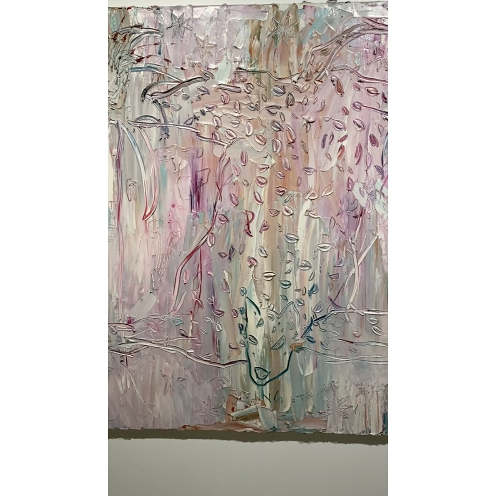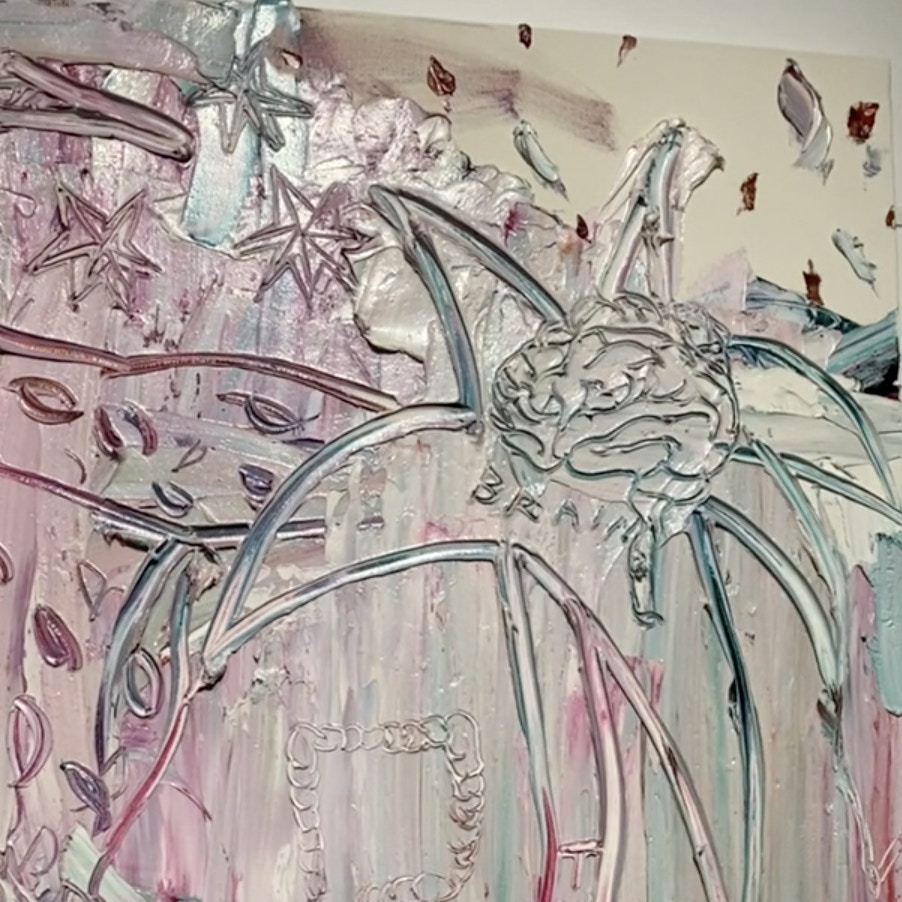 ラッカースプレーなどを用いた土取郁香の作品《I and You (knock knock knock)》は、高橋が土取に発注して制作がなされた、本展が初公開となる新作。直接作家とコレクターがやりとりできるのは、現代美術というフィールドならではのことだ。