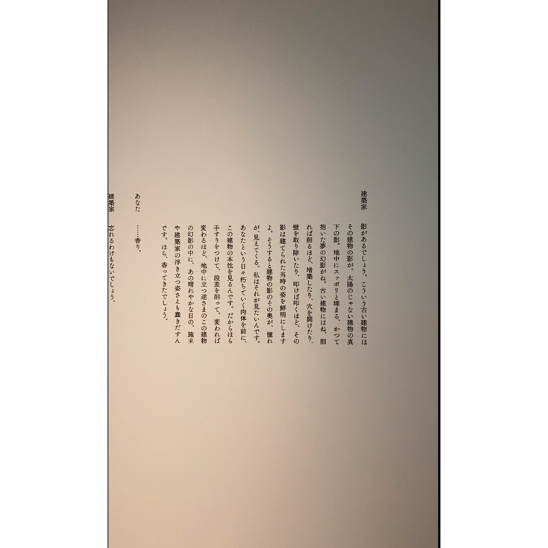プロローグに続き展示されるのは、建築家と詩人らのコレボレーション。建築を発想源に生み出される言葉は、様々なスタイルで表現されている。