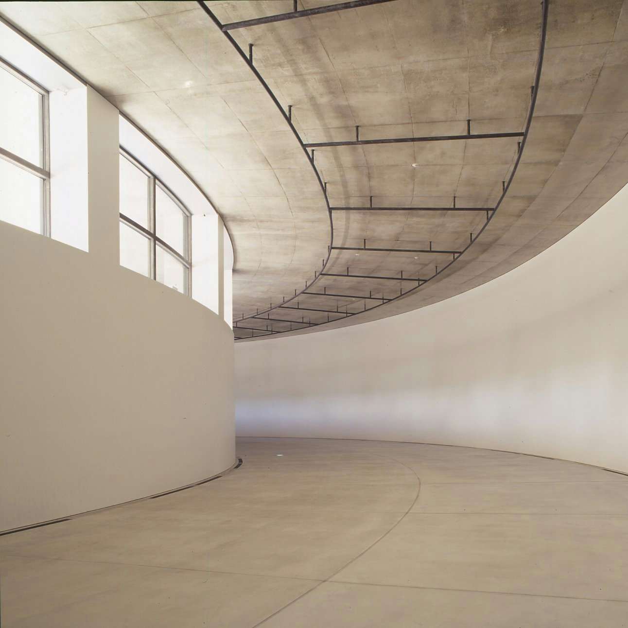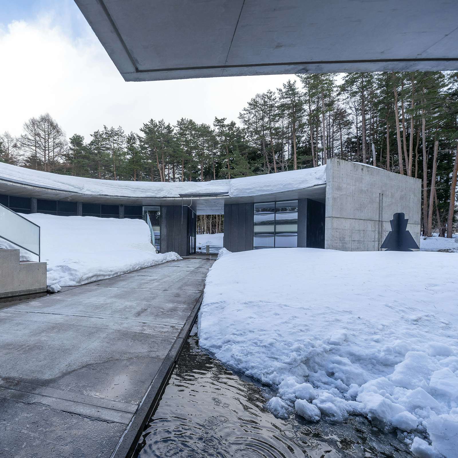 ACACは、JR青森駅からバスで40分近くかかる山の中にある。周りはほとんど森そのもので、筆者が来訪したときには雪で埋もれていた。展示室であるギャラリーAは、ホワイトキューブによくある直線ではなく、雪国のトンネルのように曲がっていて、上には窓が開いていて光が差し込み、作家にとっては使いにくそうであるが、しかしそのような「通常ではない環境」に対応することこそが、アーティストにとって新しいチャレンジや認識を得ることになるし、鑑賞者の他にない体験価値になるのだろう。ギャラリーAは、通路を挟んでギャラリーBにつながり、隣の部屋は一面ガラスで外につながっていて、円周を延長していけばそのまま屋外になっているように設計されている。「自然」「環境」との連続性を意識させるようにデザインされているのだ(設計は安藤忠雄)。
