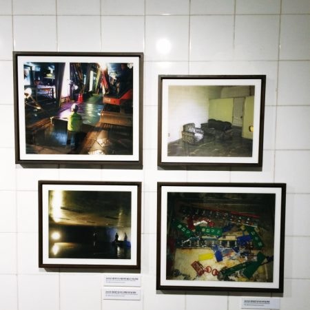 SeMA Bunkerは、大きく企画展スペースと、この地下壕についての歴史的資料を並べた歴史ギャラリーの2つに分かれており、前者がすっかりホワイトキューブへと改修されてしまっているのに対し、歴史ギャラリーは壁やトイレ、暖房器具などが発見時そのままに残されている。筆者は何気なく設置されていたヒョウ柄のソファに腰掛けたのだが、すぐさまそれが大統領が座るためのソファそのものであることに気付かされることとなった。大統領のためのソファに、来場者が自由に座ることができる状況。大統領が用をたすための便器を、一方的にまなざせる展示室。ここには、ルーヴル美術館誕生の瞬間──公衆が貴族の空間へと侵入した瞬間──と一見似た、しかし確実に異なるモチベーションが存している。