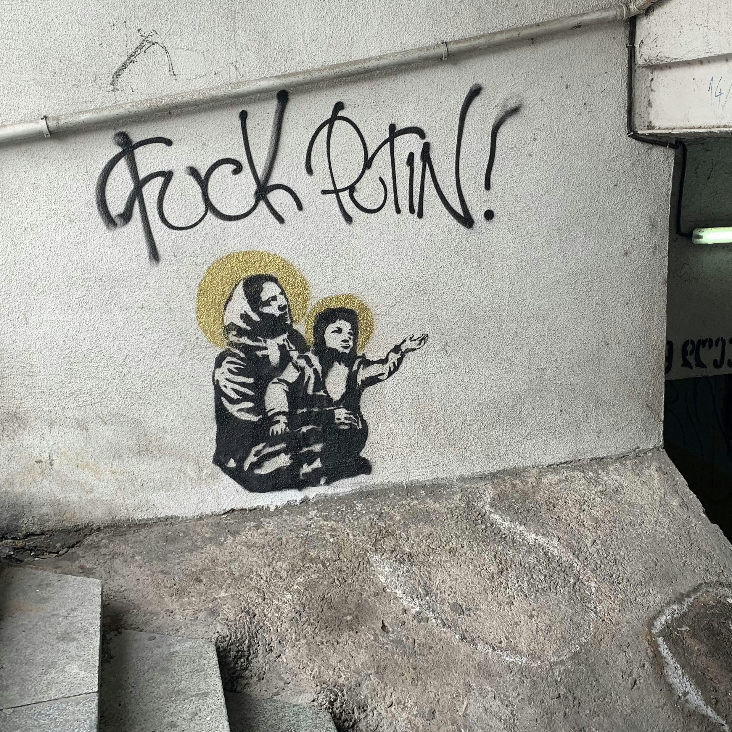 トビリシの街は、壁があるところにはグラフィティというくらい、どこにでも文字や絵が描かれている。到着して数週間のあいだにも壁は更新され続けていて、そのなかに「Fuck Putin」の文字が目立つようになってきた。次第に「Fuck Ruzzia」の文字(Zはロシア軍の意)など、ロシア自体を嫌悪する書き込みも目立ってきている。プーチン憎しは分かる。しかし長きにわたってロシアの影響下にある歴史を考えれば、ロシアを否定することは自分たち自身の一部を否定することなんじゃないかとも思う。近年、トビリシに残るソ連時代のレリーフや建造物が次々と壊されているそうだ。重たいソビエトを早く脱ぎ捨ててしまいたいのだろうか。