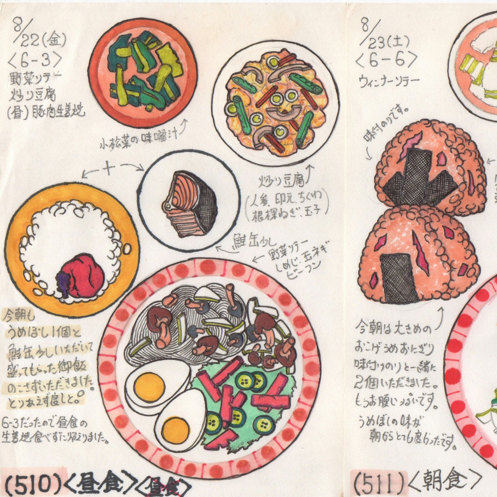 そんな小林さんが、食事の絵を描き始めたのは18歳の頃だという。当初は、家に帰ってから食べた物を思い出してメモに残しておく程度だった。「ただの日記帳代わり」と言うが、そのメモには使われていた食材や盛り付け方、料理の感想に至るまで忠実に再現されている。何という記憶力なのだろう。それが26歳のときからは、家にあったルーズリーフバインダーに突然書き溜めたメモを清書して絵を描くようになり、その行為を35年ほど経った今でも続けている。