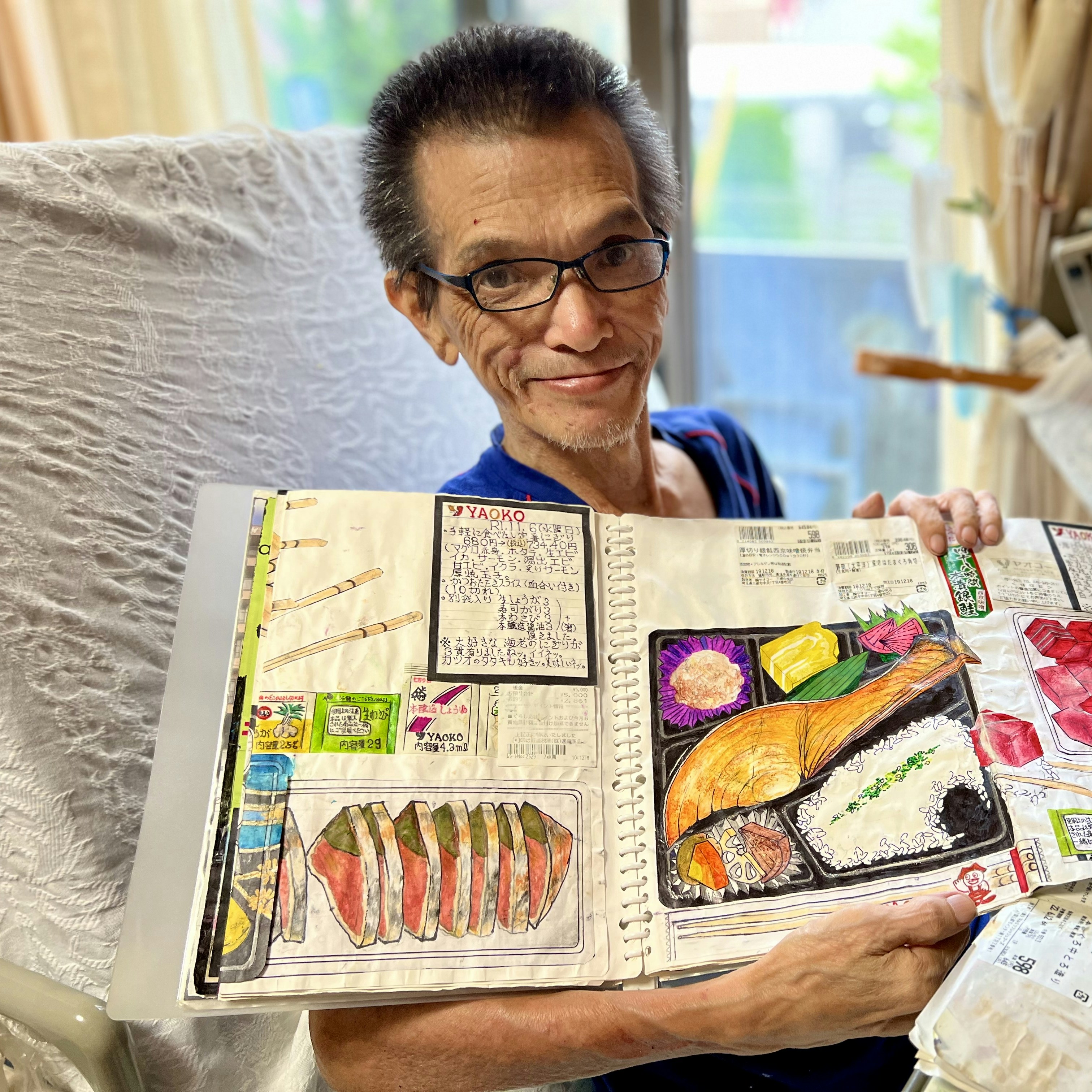 46歳のとき、アルコール神経炎で歩行困難な状態となり、生死の境をさまよいながら奇跡的に一命を取り留めたものの、歩行障害が残ってしまう。入院やリハビリを経て、車椅子から杖をついて何とか歩けるようになった2015年1月に、僕は小林さんと出会った。そこからもう7年もの付き合いになるが、自宅の居間の一角に座り込んでいた小林さんは次第に介護用ベッドへ移り、介護度も上がった現在は、ホームヘルパーに頼らなければならない生活を送っている。ベッドの上から移動することも困難なため、大好きな外食もできなくなり、毎日の食事はもっぱら配食サービスやヘルパーに買ってきてもらったコンビニの弁当を食べる状態だ。それでも、小林さんは絵を描くことをやめようとはしない。
