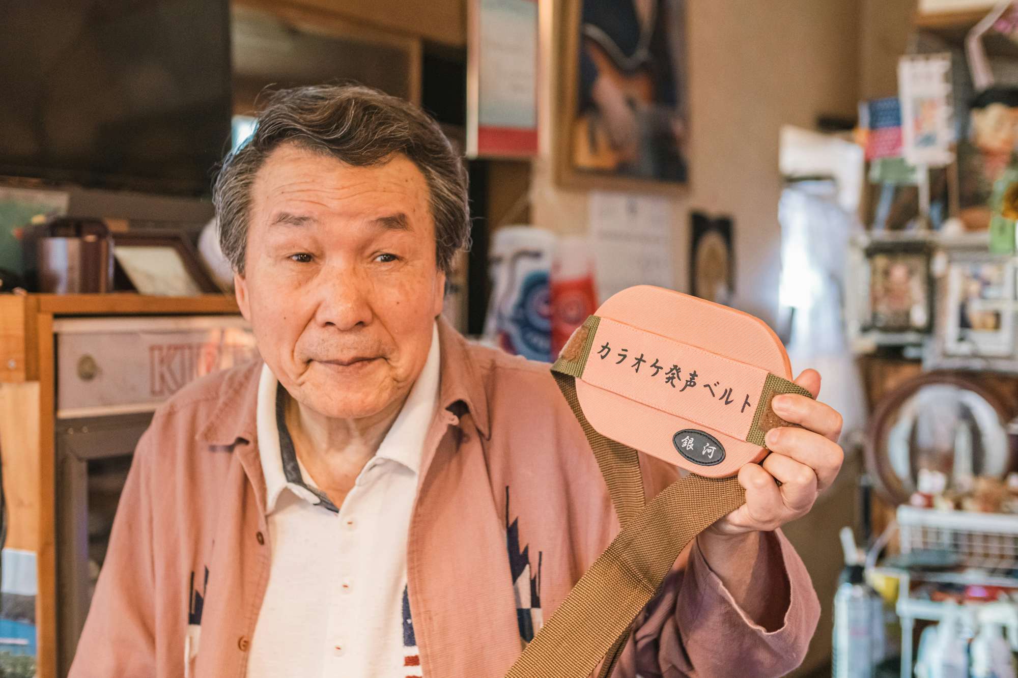 「カラオケ発声ベルト」を手にする本多さん 撮影=齋藤洋平