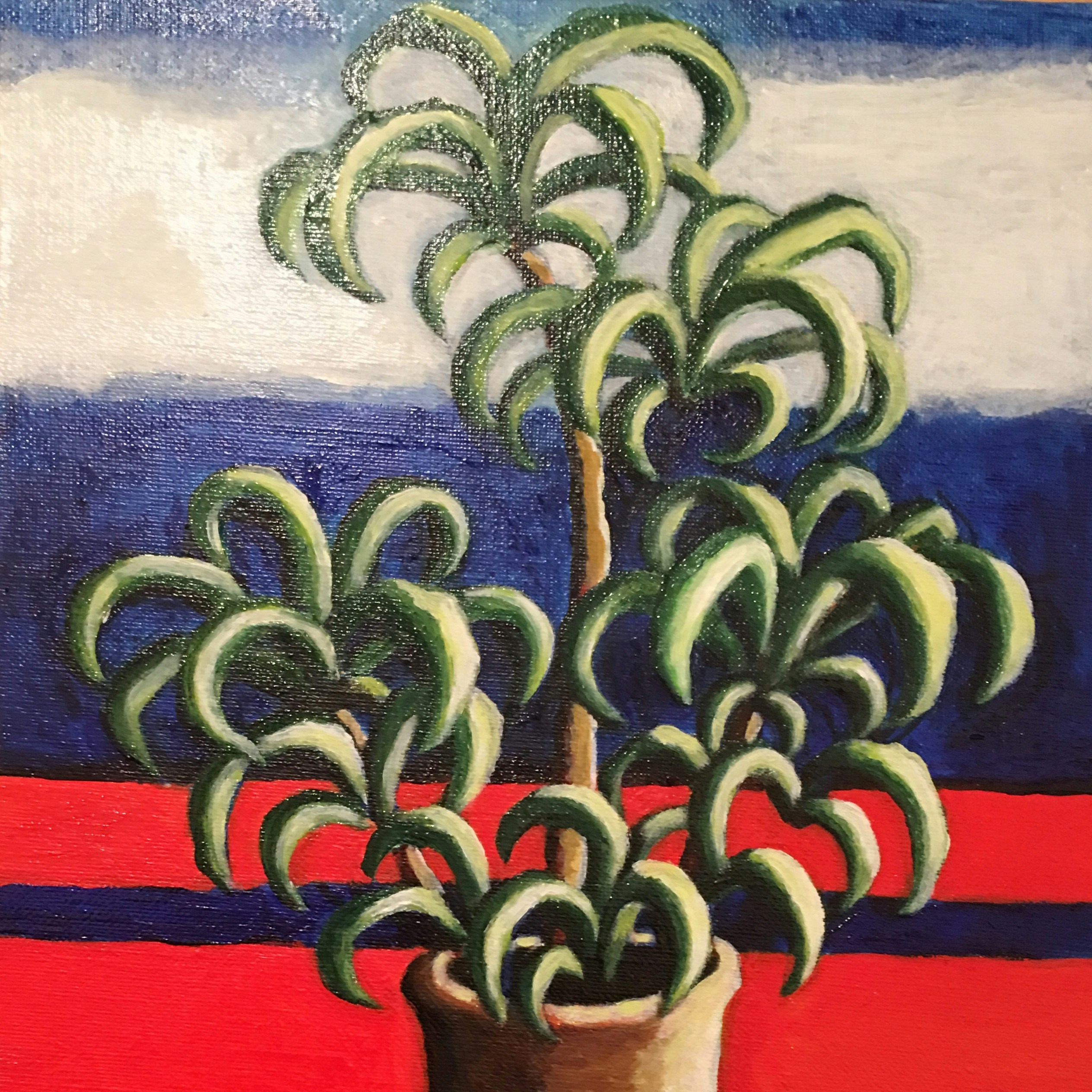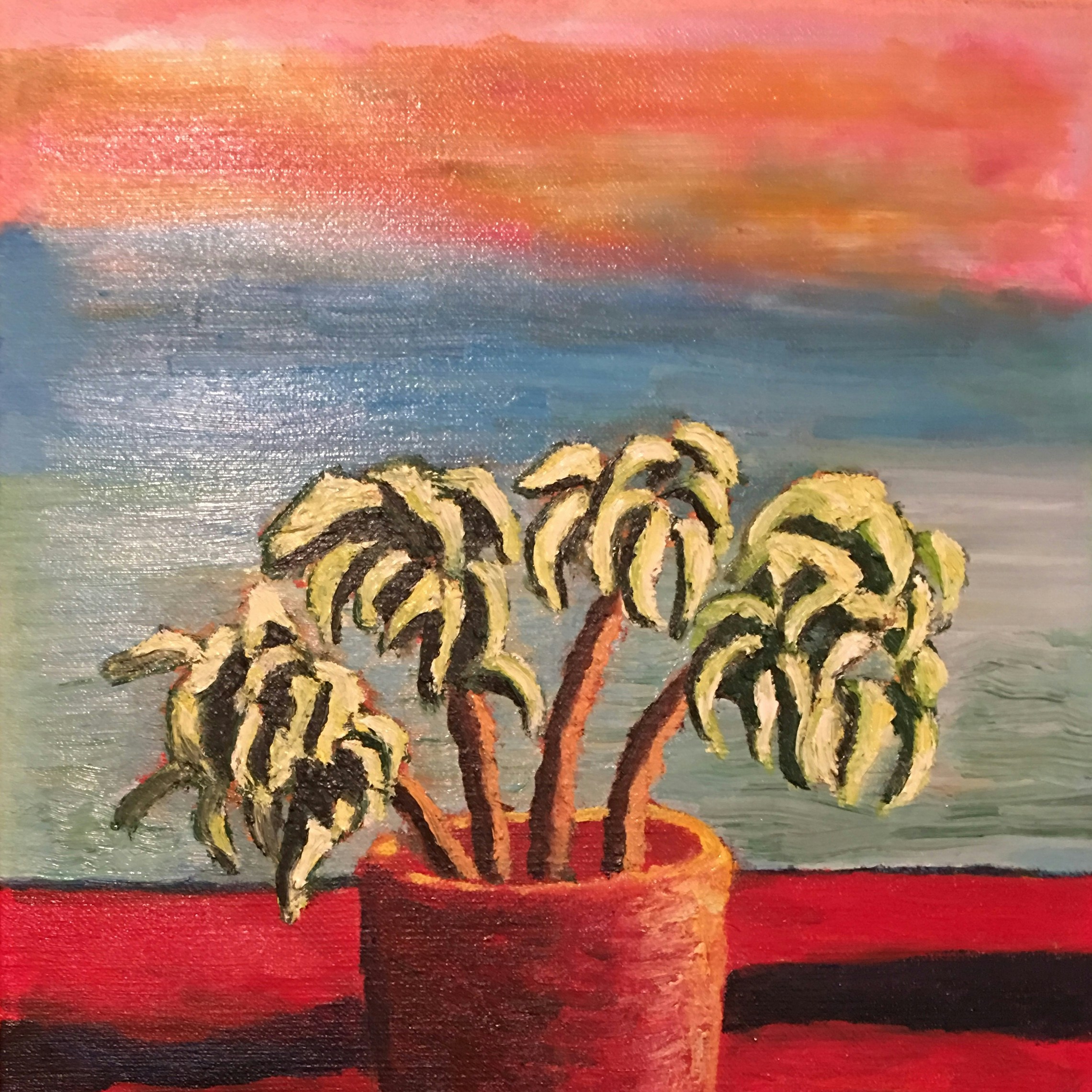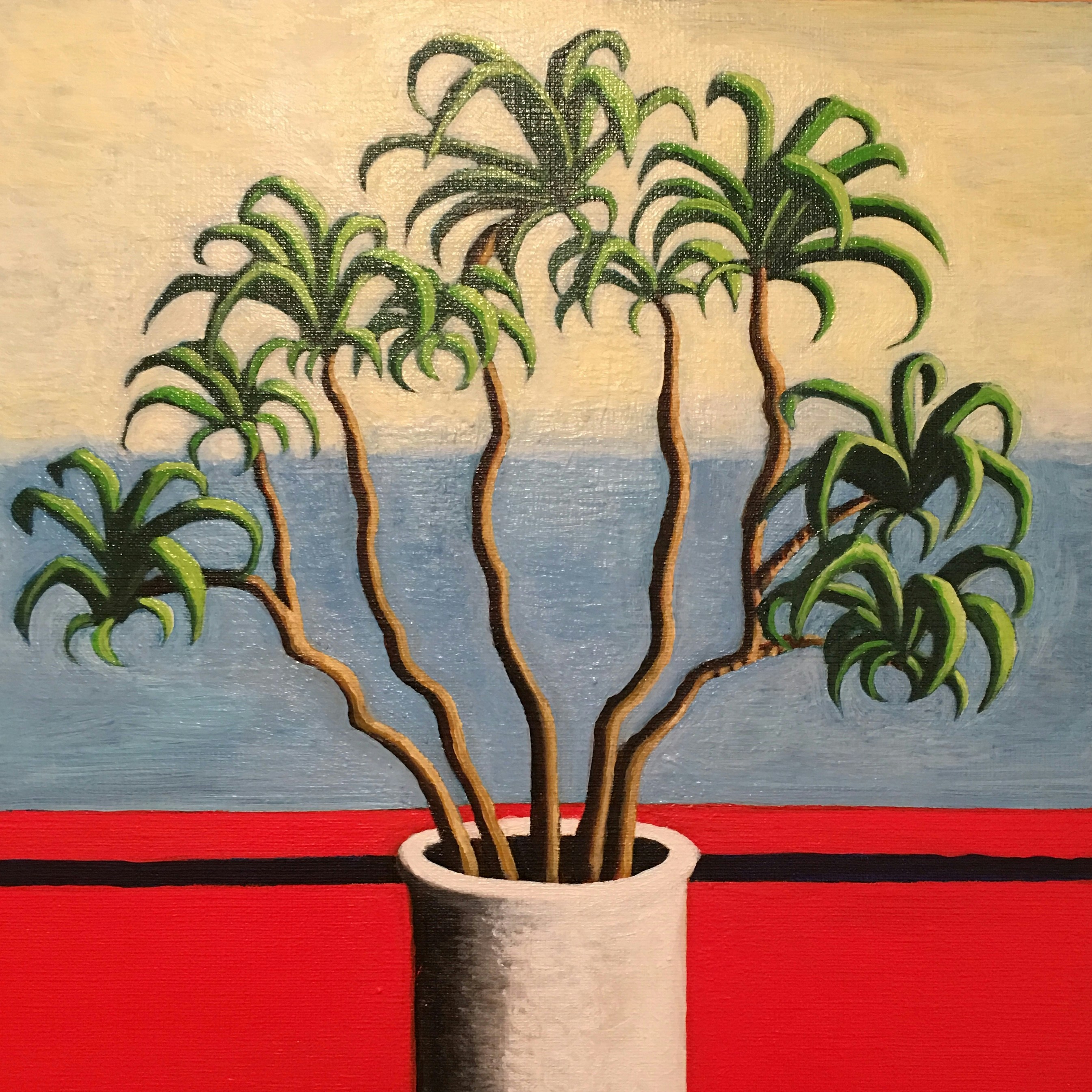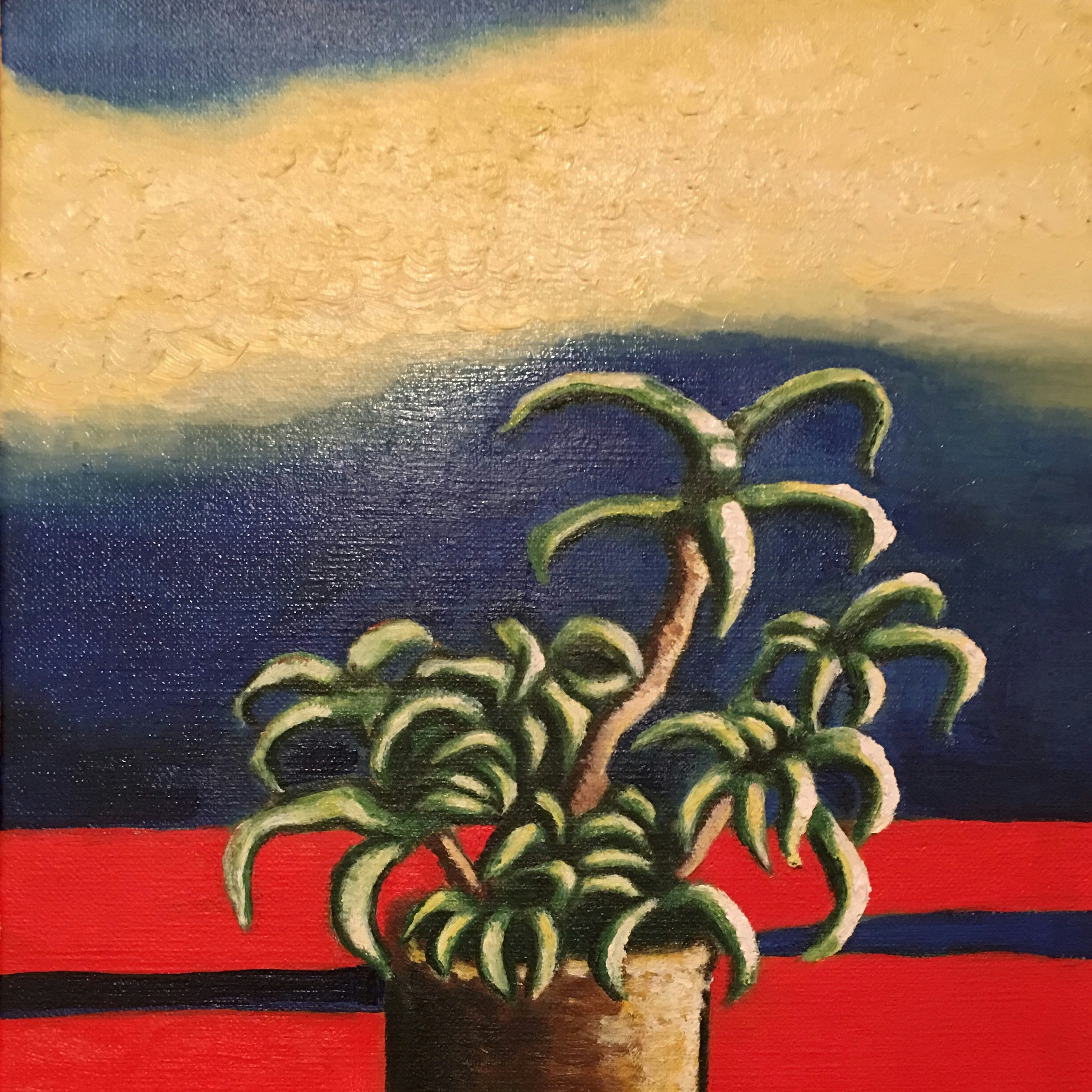案内された部屋は、壁一面に絵が飾られていた。植木鉢から伸びる植物を描いた油彩画の連作で、ほとんどが同じ構図や色づかいで描かれている。シュルレアリスム絵画のような不思議な画面構成は、不条理で謎めいた力を秘めている。