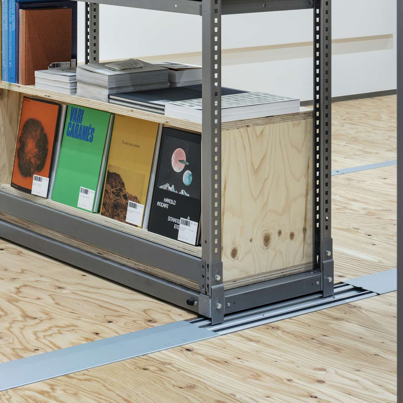 店舗内装を手がけたのは、建築家・長坂常が主宰するスキーマ建築計画。既製の業務用スチールラックを、床面へ敷設したレールを使って可動棚としており、あたかも美術館の収蔵庫を思わせるような構成。棚板の高さはもともと調整が容易で、さらに木製のボックス什器を置いたり、同じく木製の背板を着脱できるなど、棚自体のフレキシビリティはかなり高い。レジカウンターもラックを応用して製作することで同様に可動式となり、平台什器も倉庫などで使われる木製パレットを基に製作したノックダウン式。一見すると、すべてが工業的で、ある種荒々しい素材を用いて空間を構成しているが、統一感があり、規則性が貫かれてまとめられているため、上品な印象も受ける。隣接した東京オペラシティ共有部の、床や壁は石をふんだんに使った、高級感はあるもののどこか冷たさを感じる空間とは対照的で、温かみも感じられる。店名サインの入ったガラス面以外は、間口も大きく取られており、店内にも入りやすい。