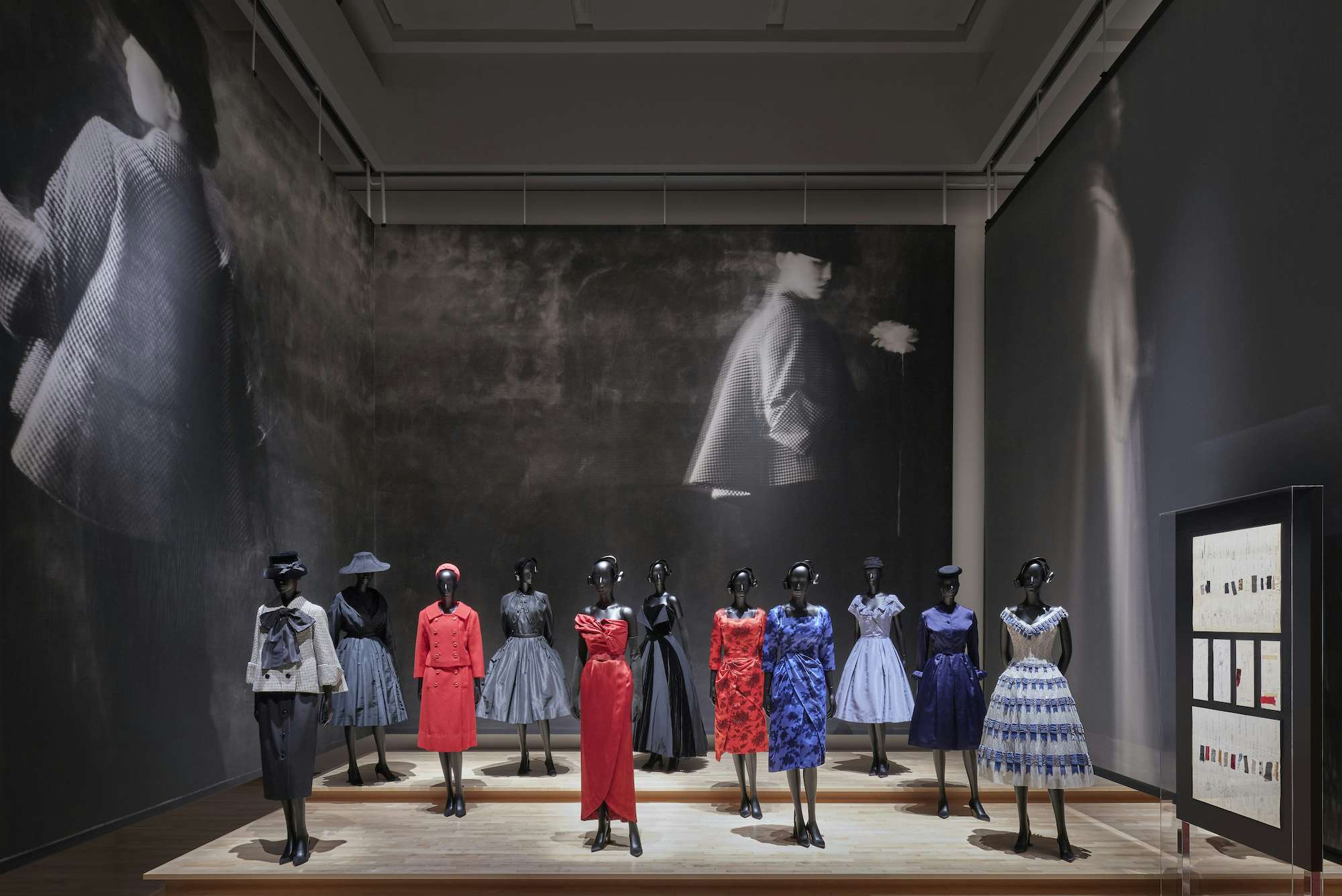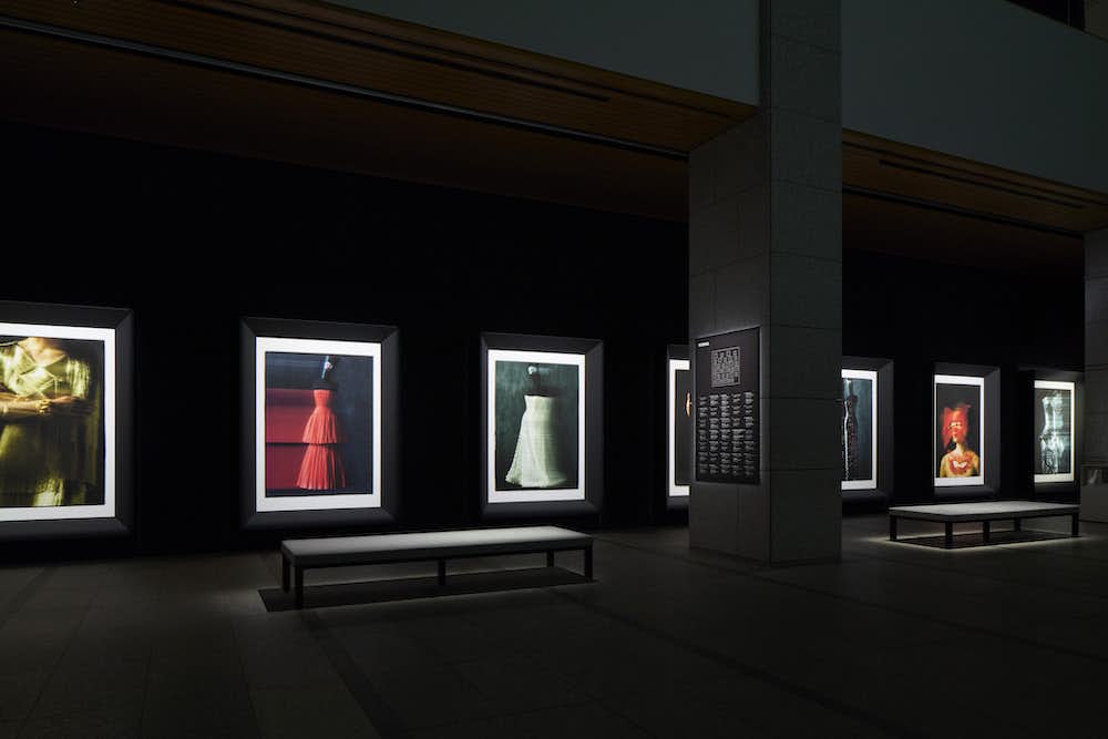 展示風景より、クリスチャン・ディオールが1957年秋冬オートクチュールコレクションで手がけた「JAPON」も並ぶ