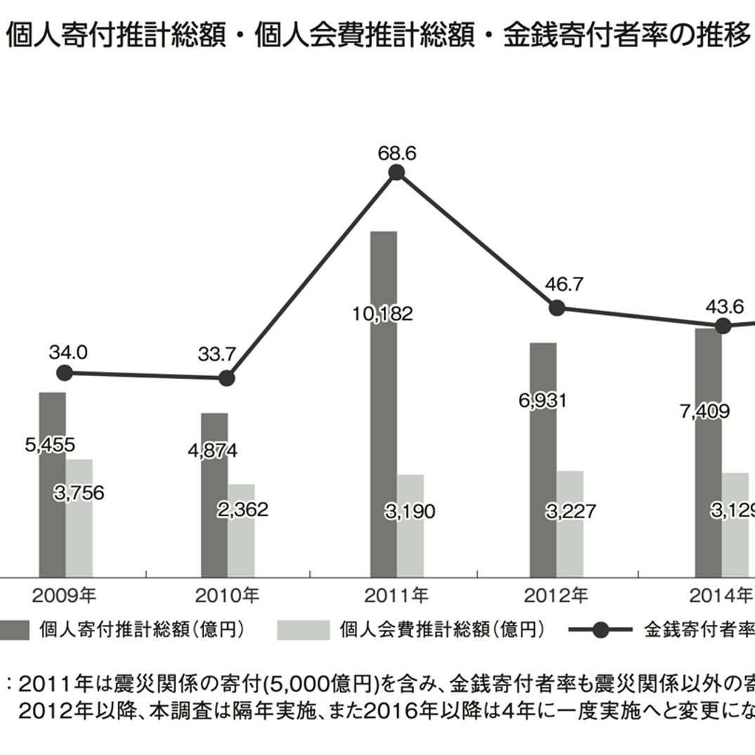 まず全体的な傾向として言えるのは、日本人の寄付行動がこの十数年でかなり変化したことだ。調査を開始した2009年に約5,500億円だった個人寄付の総額は、2011年3月の東日本大震災を契機に初めて1兆円を超え、2020年には約1兆2,000億円に上った(金額はふるさと納税を含む)。金銭による寄付を行った人の割合も、09年は約3割だったのが、11年には約7割に跳ね上がり、その後は4割台が定着。とはいえ、先進国の中では寄付総額・寄付者率ともに依然として低い水準にあり、寄付先進国とされる米国と比べると個人寄付の総額は約30分の1に留まっている。