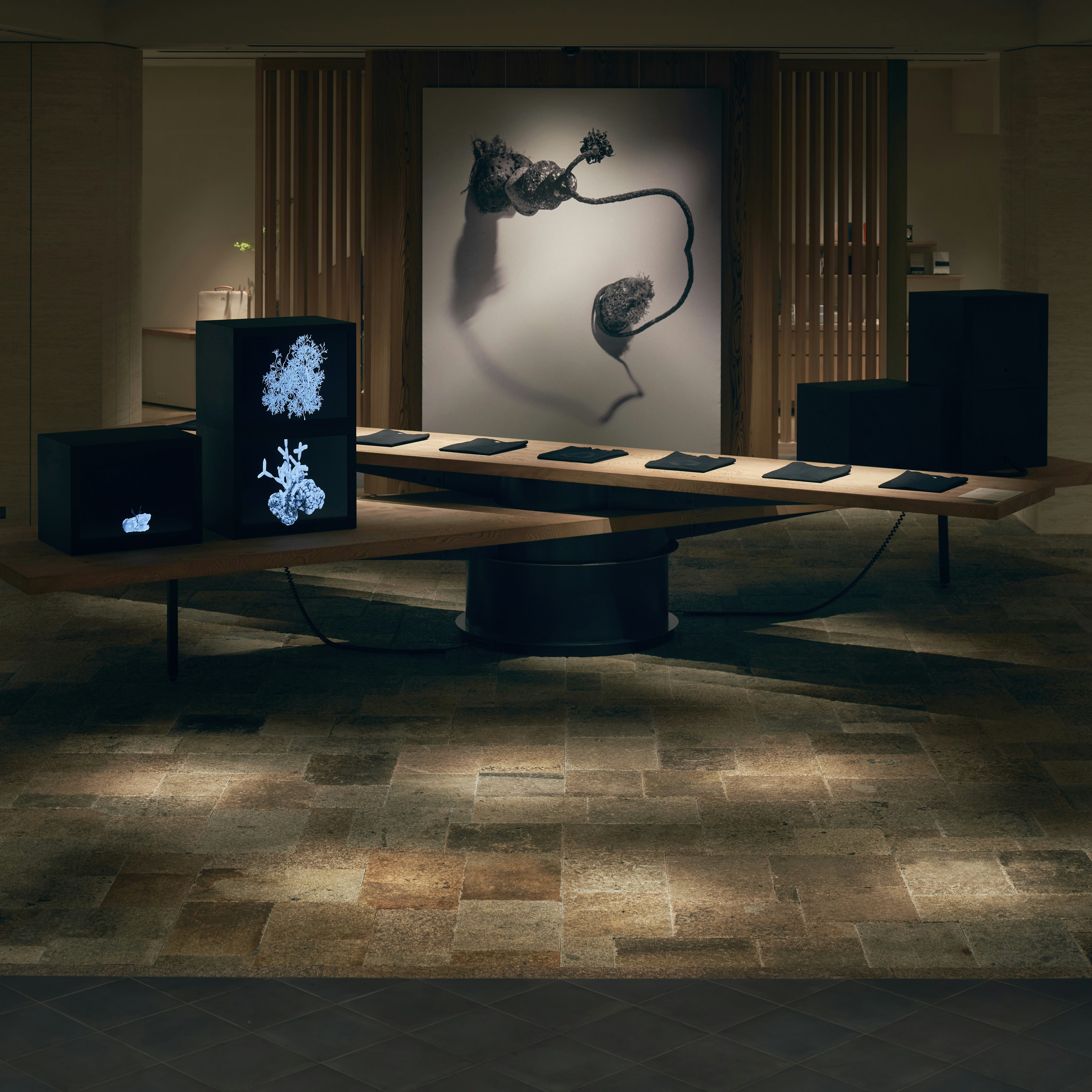 「私たちは、本質的な豊かさを持つ、日本を代表するブランドになりたいという思いがあり、その思いをもっとも強く発信できる場所としてこの地階を考えました。季節の移ろいや自然との付き合い方から生まれる日本の美意識や習慣、商品に関わるストーリーを『時』ととらえ、それらを表現する場所として『時の舞台』があるのです。新たな地階には新素材研究所の世界観がはっきりと表現されており、時間の積層や伝統的な手法などが詰まった場所となりました」(山本)。